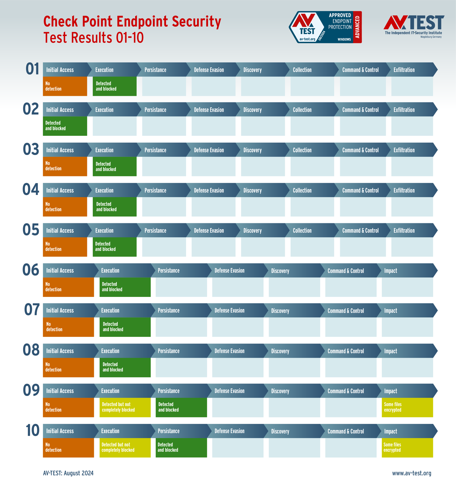 Решение от Check Point обнаружило атаки во всех 10 сценариях, но в двух случаях с программами-вымогателями не смогло полностью предотвратить атаку. На последующих стадиях защита остановила массовое шифрование, но отдельные файлы все же были зашифрованы. Это стоило продукту 2 баллов, и его итоговый результат составил 33 из 35 баллов.