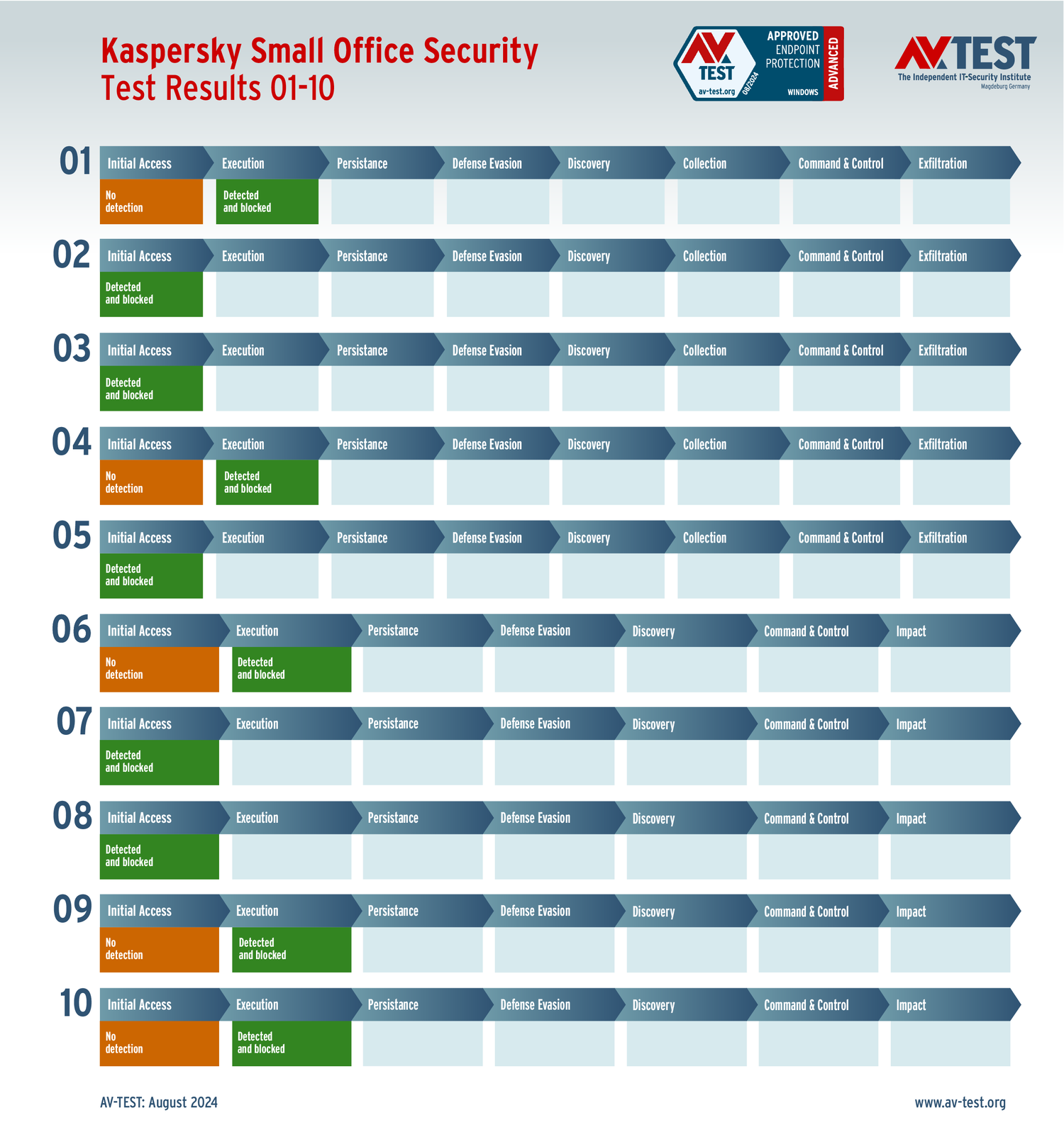 Цель тестирования Advanced Threat Protection (ATP) заключалась не только в обнаружении угроз. Основной задачей была проверка способности защитных продуктов эффективно сочетать свои компоненты, чтобы выявлять и блокировать скрытые атаки. В тесте участвовали шесть решений для домашних пользователей и восемь для корпоративного сектора. Испытания проходили с июля по август 2024 года в тестовых системах Windows 10.