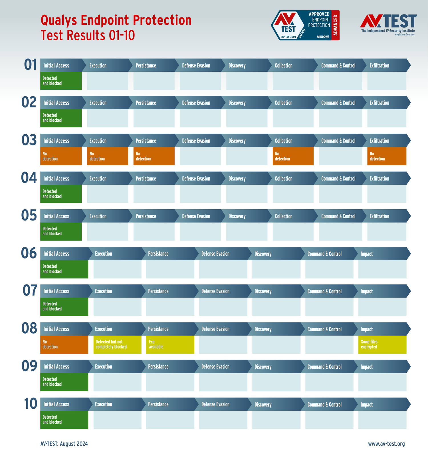 Решение Qualys для конечных точек выявило 9 из 10 атак, допустив утечку данных из-за инфостилера, что привело к потере 4 баллов. Кроме того, была частично остановлена еще одна атака программы-вымогателя, в результате чего отдельные файлы оказались зашифрованными. Итоговый результат Qualys составил 29,5 баллов из 35.