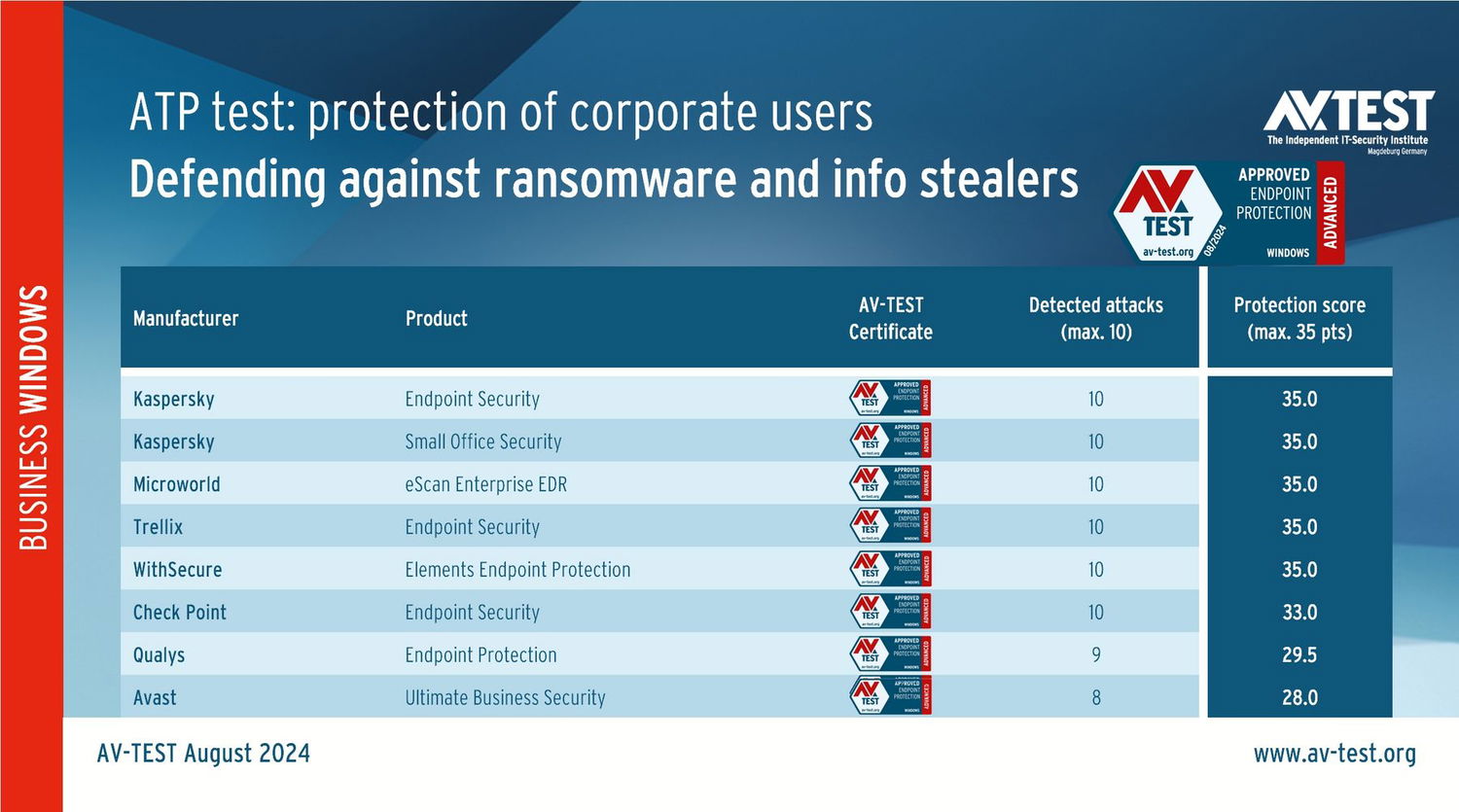 Чтобы получить сертификат «Advanced Approved Endpoint Protection» от AV-TEST, антивирус должен был набрать не менее 75% (26,5 баллов) от максимальных 35 баллов. Все протестированные корпоративные решения превысили этот порог.