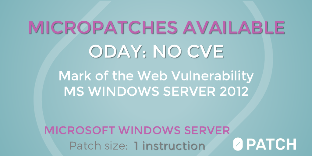 Компания ACROS Security через свою платформу 0patch Agent для Windows выпустила бесплатные неофициальные исправления безопасности для устранения уязвимости «нулевого дня» в Windows Server 2012 и Server 2012 R2, появившейся более двух лет назад в механизме безопасности Windows Mark of the Web (MotW).