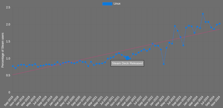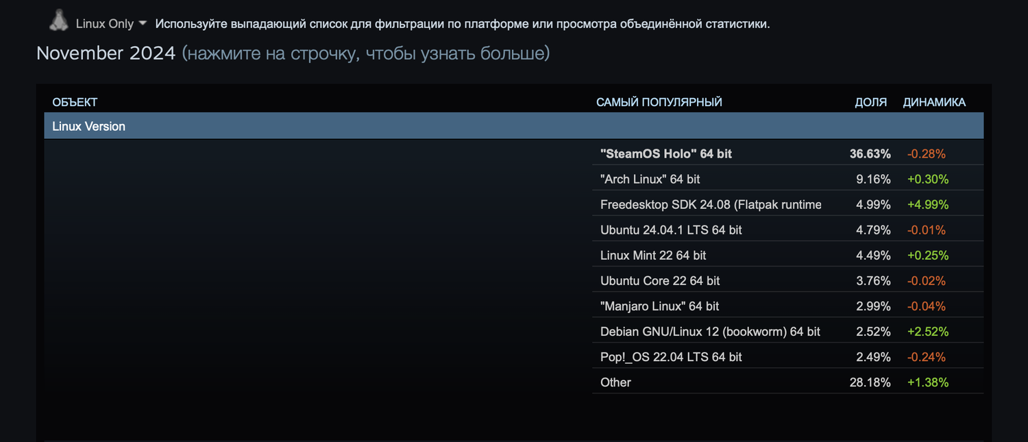 Valve опубликовала свежие данные опроса аппаратного и программного обеспечения Steam за ноябрь 2024 года. Хорошие новости для пользователей Linux: доля системы снова удерживается на уровне выше 2%.