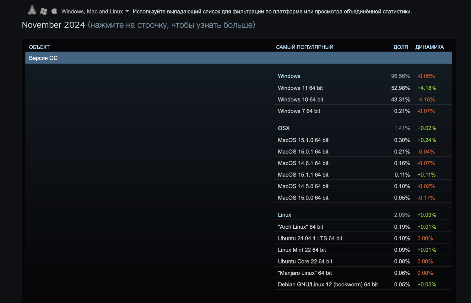 Полные результаты доступны на странице Данные об оборудовании и ПО пользователей: November 2024.