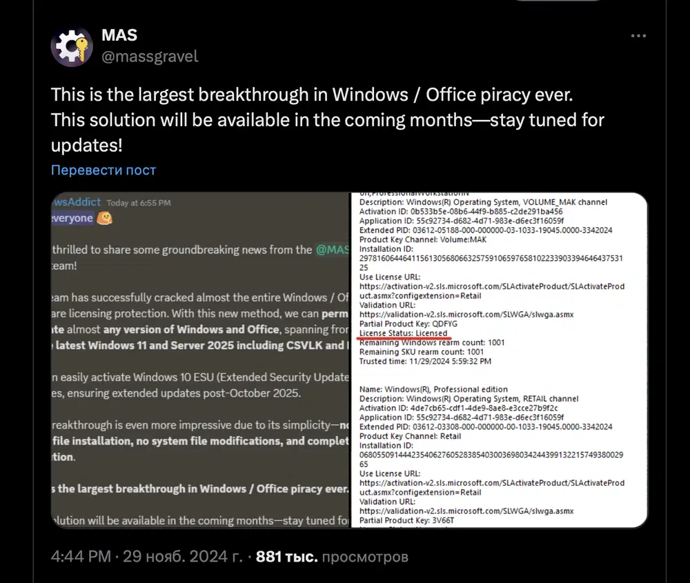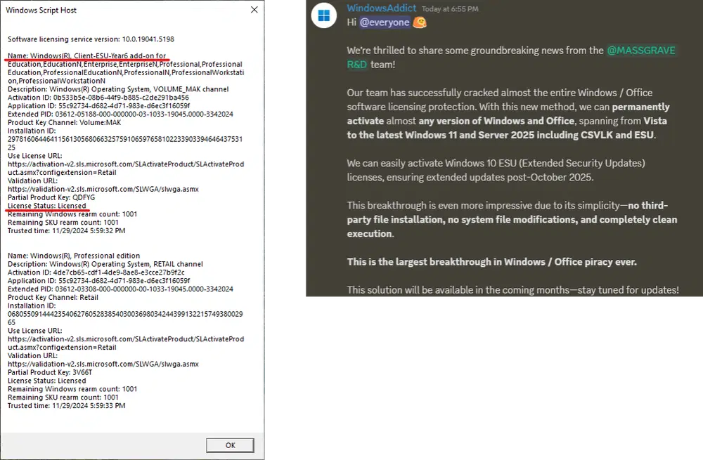 Команда @MASSGRAVE R&D утверждает, что обнаруженный метод прост — он не требует установки сторонних файлов или изменения системных файлов. В качестве подтверждения они приводят скриншот с постоянно активированной версией Windows с расширенными обновлениями безопасности.