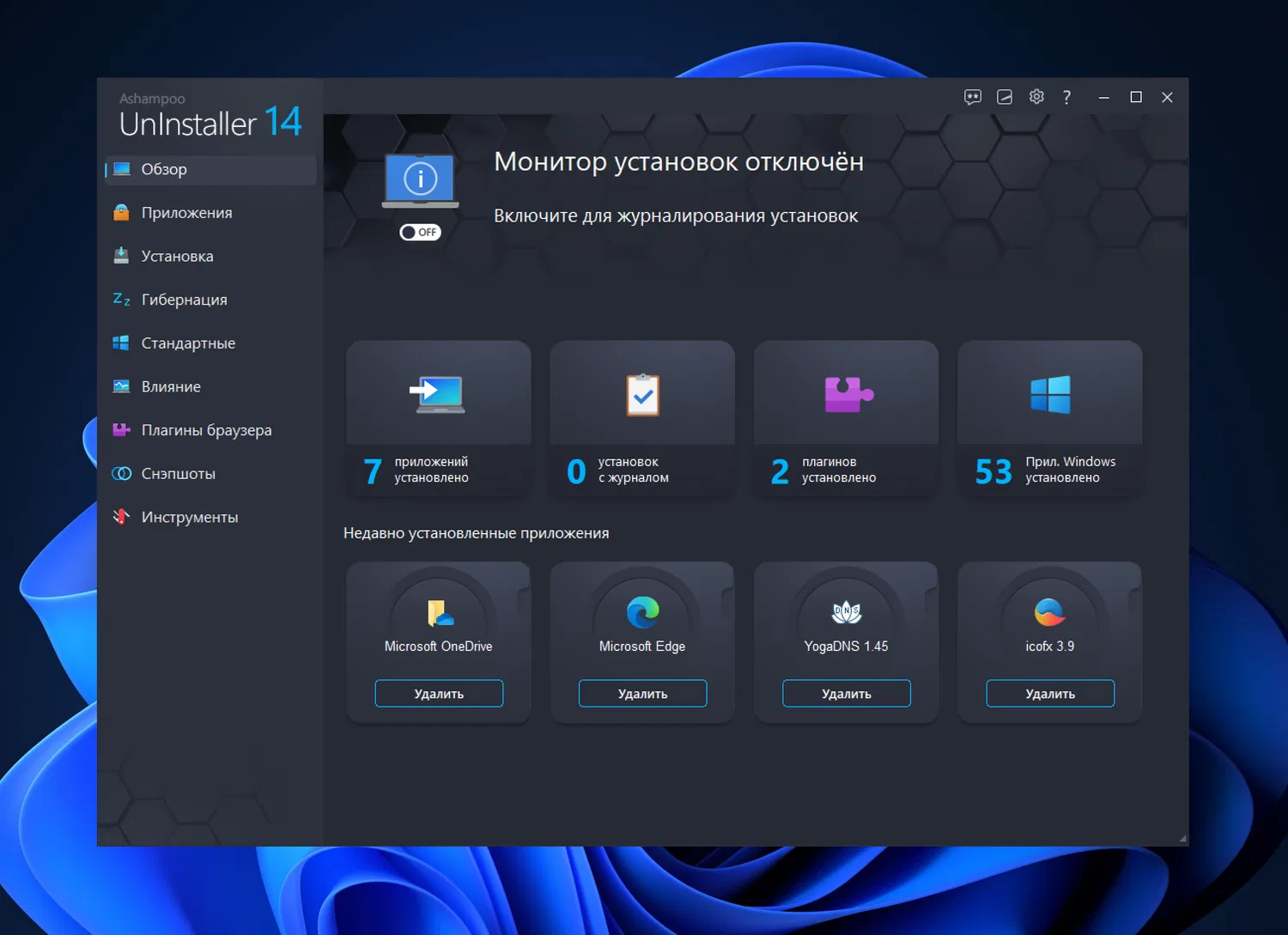 - Мониторинг установки: Технология мониторинга фиксирует все изменения в системе и файлах при установке программ и полностью отменяет их при удалении.