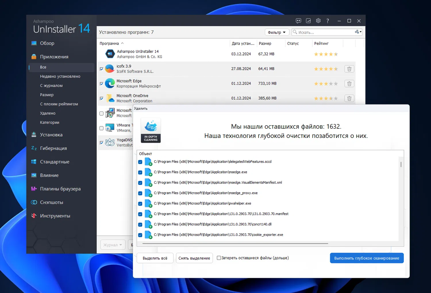 - Тщательное удаление: Используются пять методов удаления, включая глубокую очистку, что гарантирует удаление даже сложных вложенных установок.