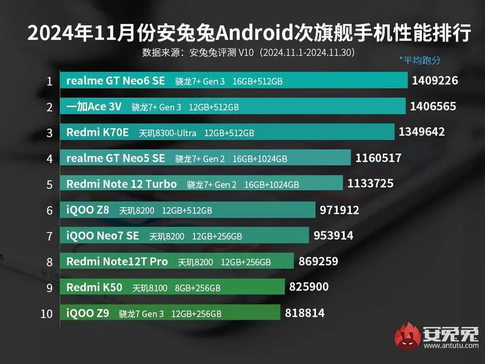 Позиции с третьей по седьмую сохранили стабильность по сравнению с октябрьским рейтингом. В них вошли: Redmi K70E, Realme GT Neo5 SE, Redmi Note 12 Turbo, iQOO Z8 и iQOO Neo7 SE. Redmi Note 12T Pro поднялся на одну позицию и занял восьмое место. На девятой строчке расположился Redmi K50 с процессором Dimensity 8100, а закрывает десятку iQOO Z9, оснащенный Snapdragon 7 Gen 3.