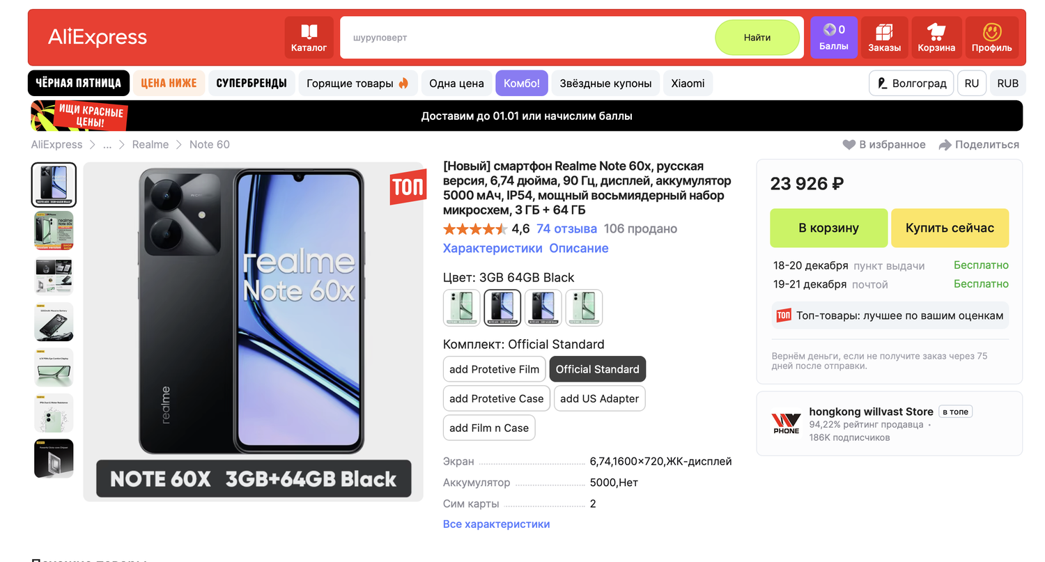 На популярной торговой площадке AliExpress появился новый смартфон Realme Note 60x. Российская версия устройства предлагается по цене около 24 000 рублей за базовую конфигурацию памяти (3 ГБ RAM + 64 ГБ). Модель позиционируется как доступное решение с акцентом на автономность работы и качественный дисплей.