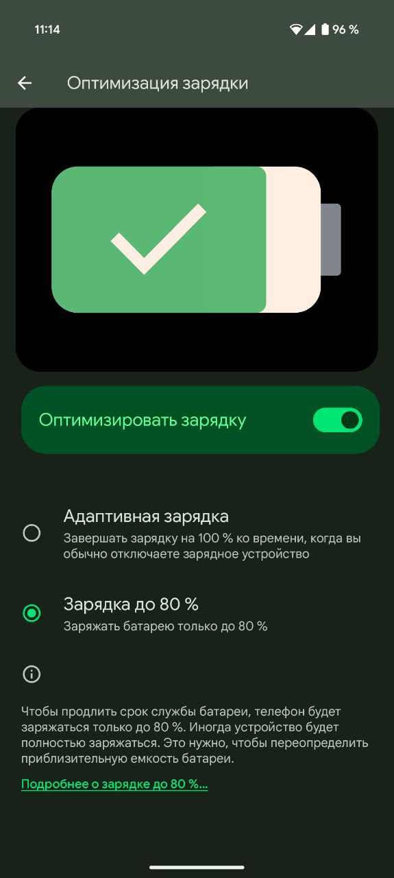 В разделе "Настройки > Батарея" реализовано меню "Оптимизация зарядки", включающее возможности адаптивной зарядки и новую функцию ограничения до 80%. При активации данного ограничения в строке состояния появляется информативный значок щита, а фирменный виджет Pixel, экран блокировки и режим always-on display отображают актуальный статус "Зарядка завершена".