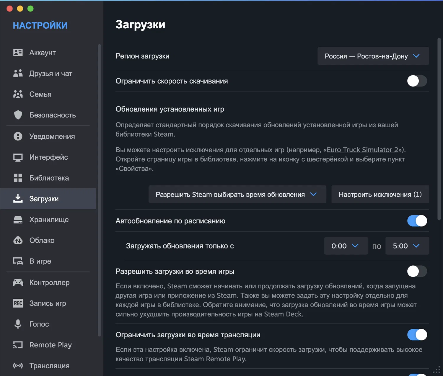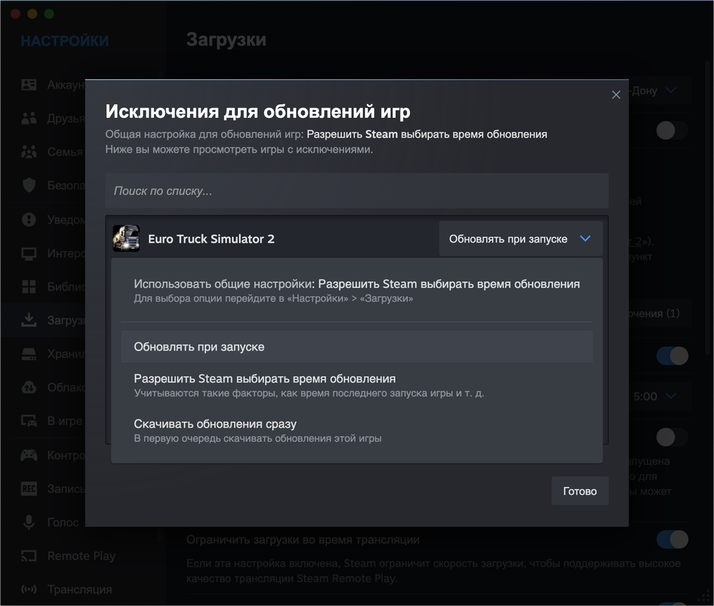 Эти настройки можно изменять как глобально, так и для каждой игры отдельно. Например, если какая-то игра получает огромные обновления, можно настроить её обновление только при запуске. А для других игр оставить автоматическое обновление.