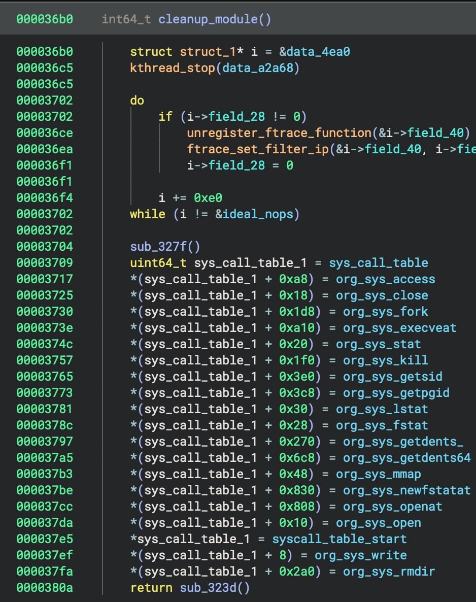 Если перехваты прерываются, руткит повторно инициализирует их, гарантируя, что его вредоносные изменения не будут отменены, а модуль не может быть выгружен.