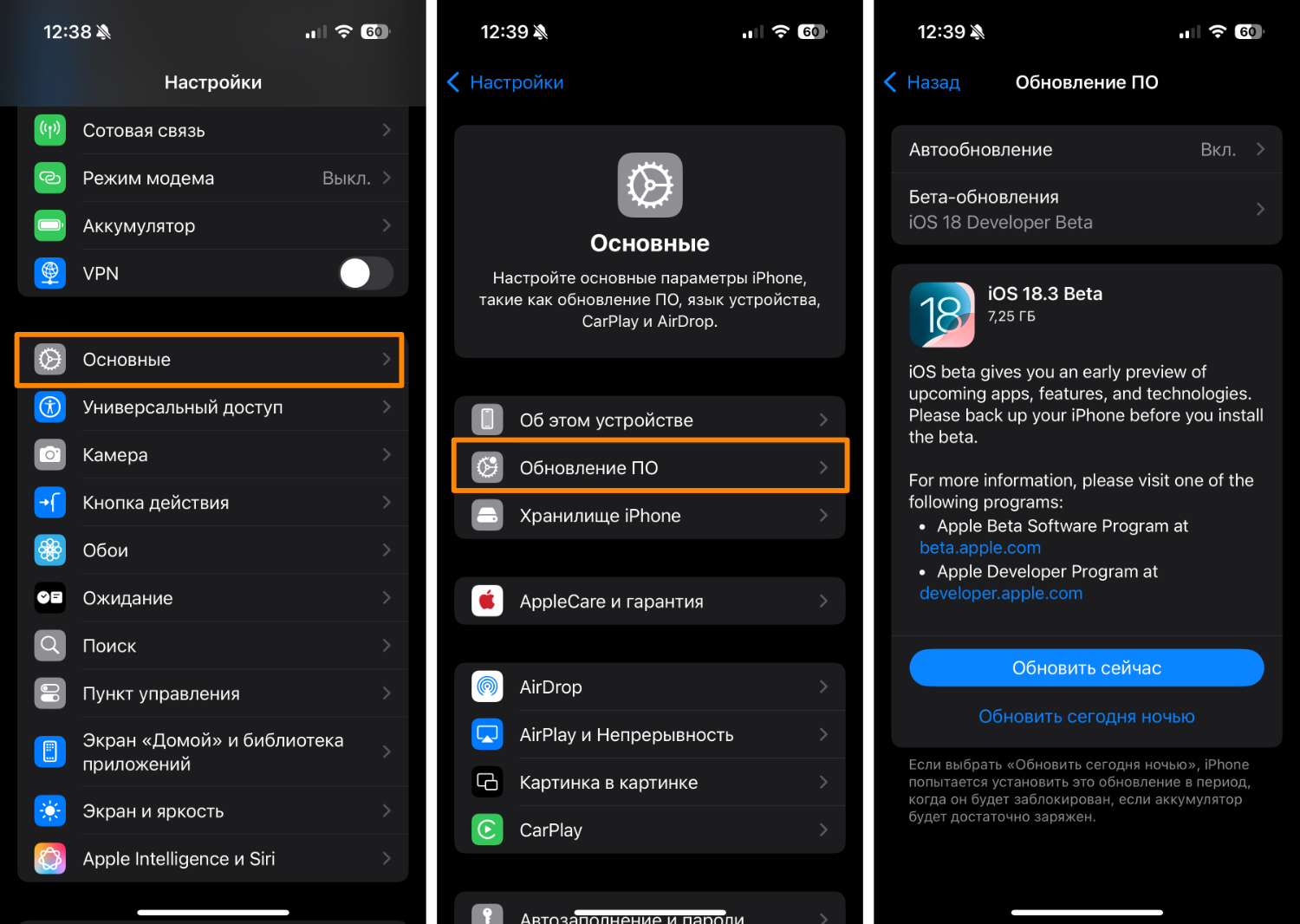 - Перейдите в Настройки > Основные > Обновление ПО > Бета-обновления и выберите опцию iOS 18 Developer Beta.