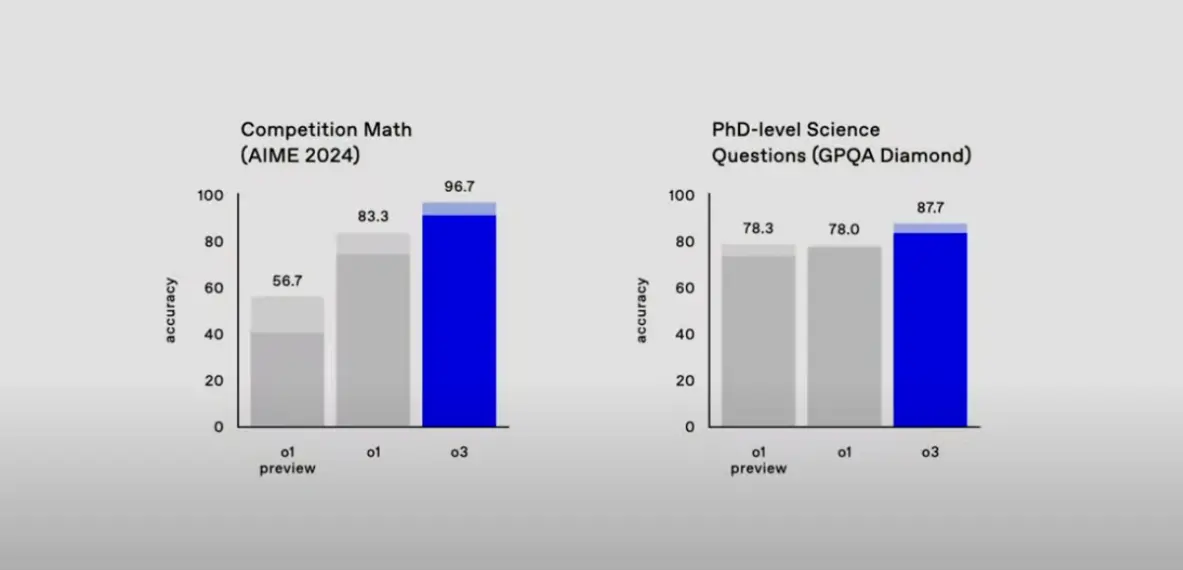 OpenAI опубликовала сравнение производительности моделей o1-preview, o1 и o3. На графиках представлены результаты в соревнованиях по математике и опросниках с научными вопросами уровня аспирантуры. Точность ответов у o3 оказалась заметно выше, что подчеркивает улучшенные алгоритмы рассуждения.