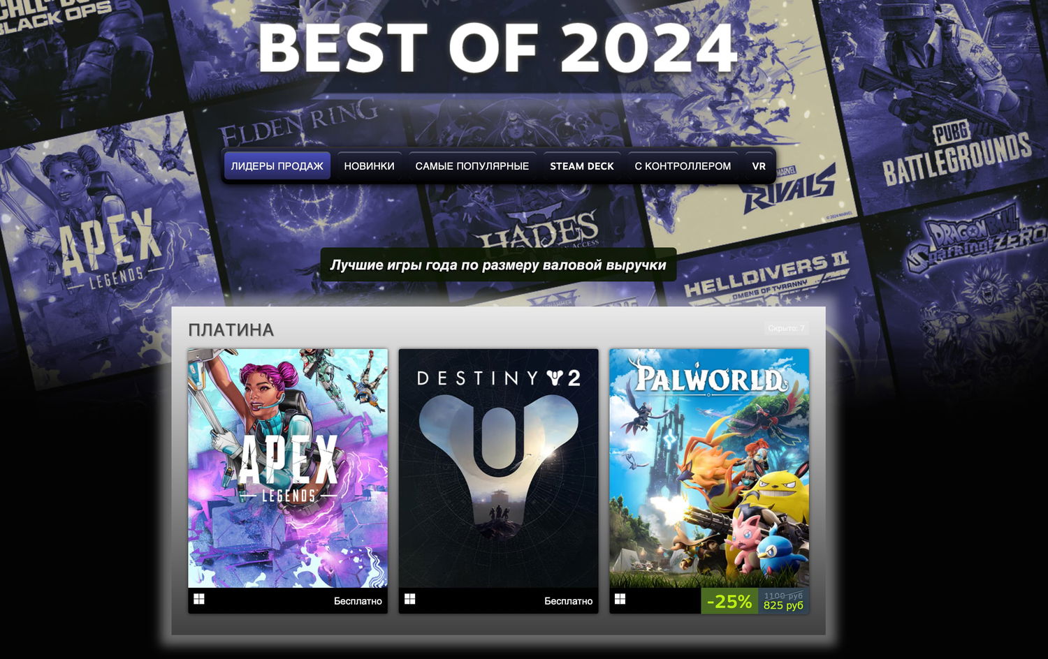 Valve разбили данные на несколько категорий: самые прибыльные игры за все время, лучшие релизы 2024 года, самые популярные по числу игроков в 2024 году, самые популярные игры на Steam Deck, проекты с наибольшим использованием геймпада и топ VR-игр.