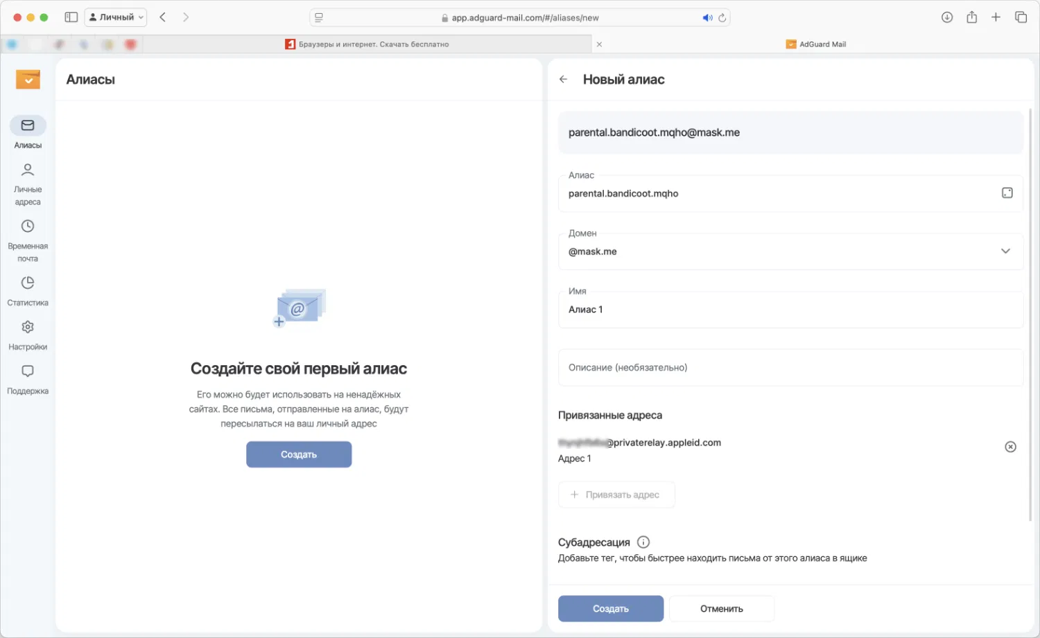 Создать почтовый псевдоним просто: выберите соответствующий раздел и нажмите кнопку «+». Псевдонимы создаются автоматически, но можно сгенерировать новую комбинацию слов с помощью кнопки генерации.