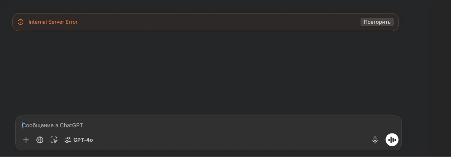 По данным из различных источников в социальных сетях и нашим собственным наблюдениям, хотя интерфейс ChatGPT загружается, система не отвечает на запросы пользователей. Некоторые пользователи также сообщают о появлении сообщения "Internal server error" (внутренняя ошибка сервера) или "Превышен лимит времени на запрос".