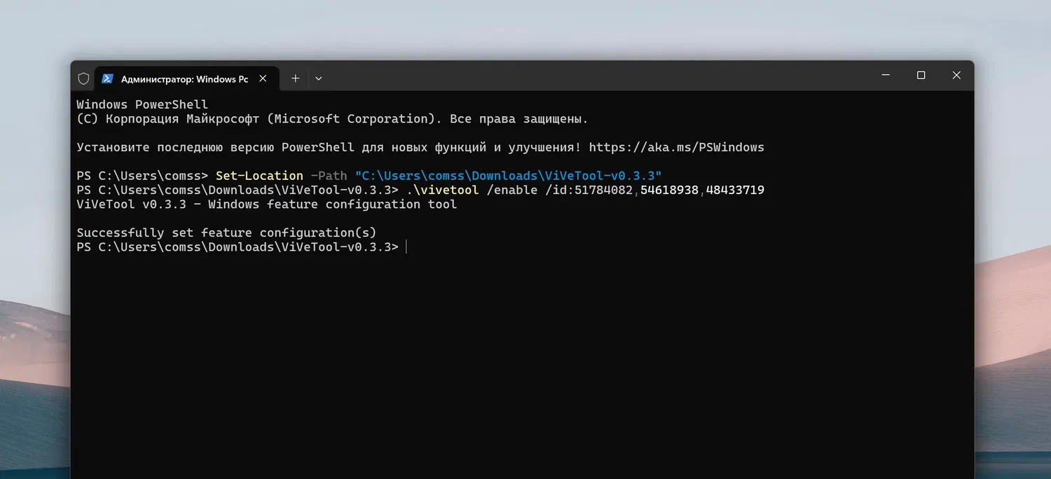 Примечание: В примерах используются команды в Терминале для профиля PowerShell. Если вы используете профиль Командная строка, замените начальную команду .\vivetool на vivetool.