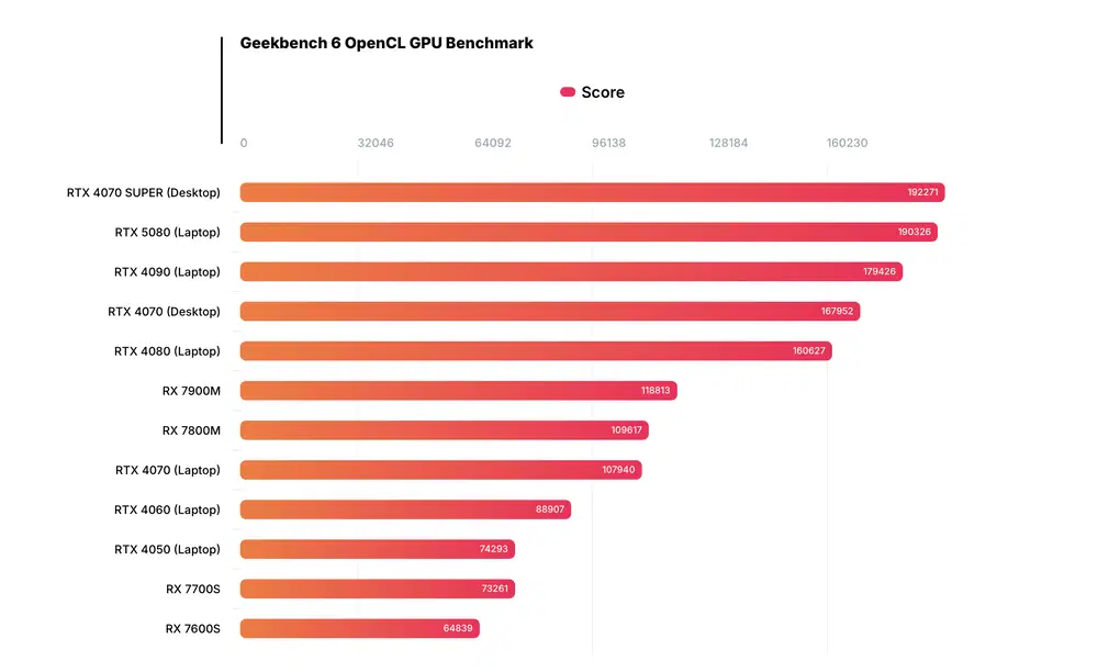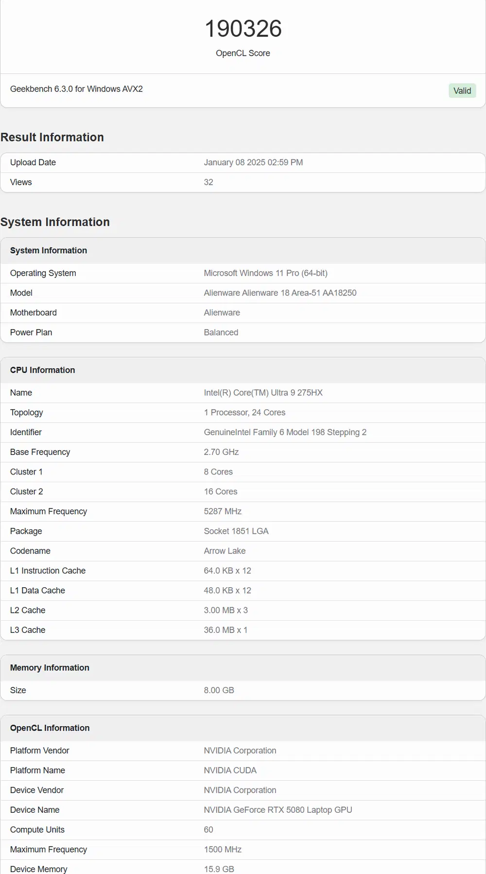 Согласно утечкам, графический процессор NVIDIA RTX 5080 был протестирован в OpenCL на ноутбуке Alienware Area-51. В тесте OpenCL он набрал 190,326 баллов, что делает его быстрее предыдущих флагманов для ноутбуков — RTX 4080 и RTX 4090.