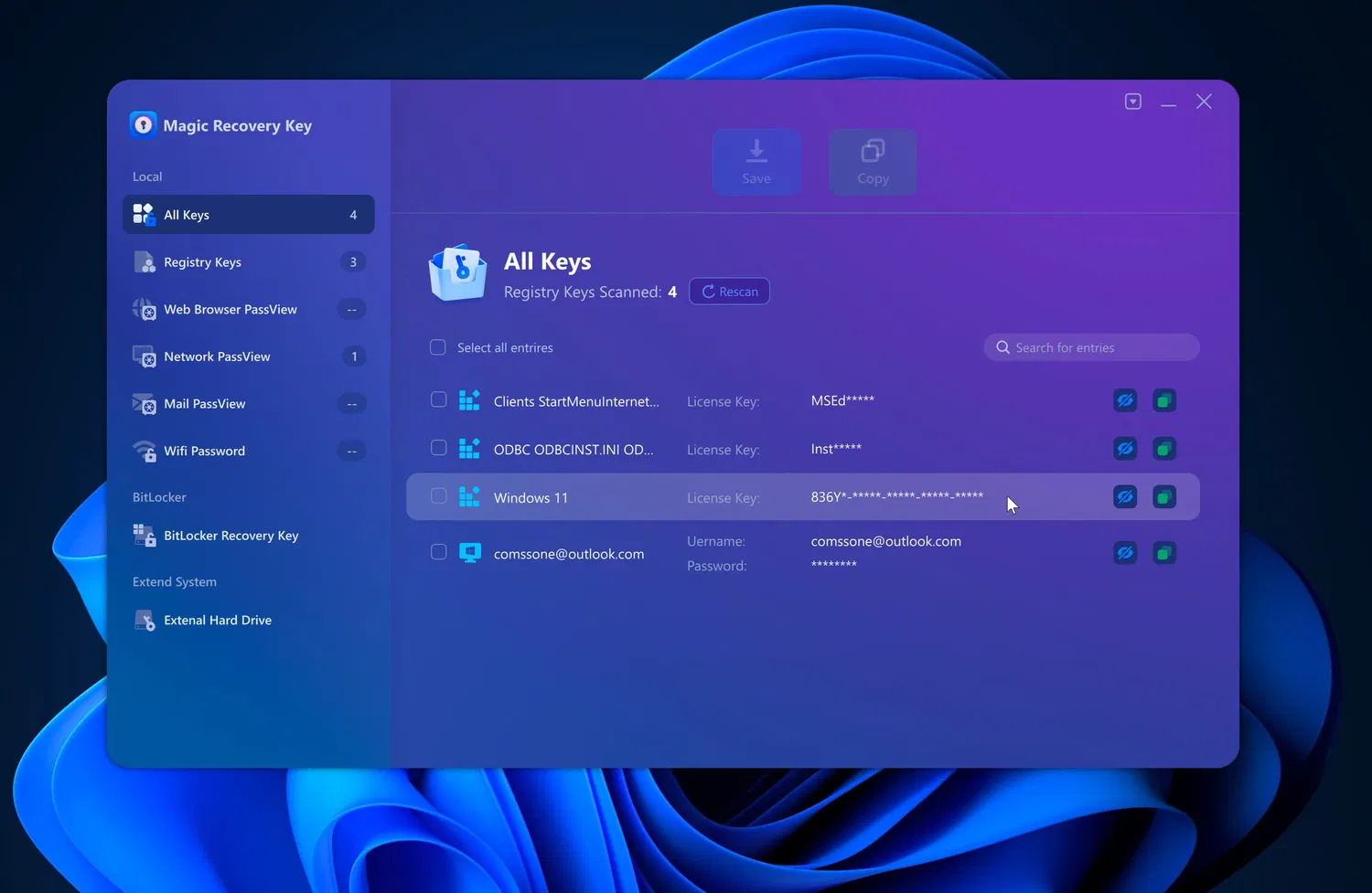 Magic Recovery Key – мощный инструмент, который помогает находить ключи продуктов для Windows и Windows Server. Программа оперативно восстанавливает лицензии при сбоях системы или жесткого диска, а также возвращает ключи для более чем 10 000 популярных программ, обеспечивая стабильную работу вашего ПО. Кроме того, утилита может извлекать ключи BitLocker для разблокировки компьютеров, что добавляет удобства и безопасности при работе с зашифрованными дисками и устранении проблем с доступом.