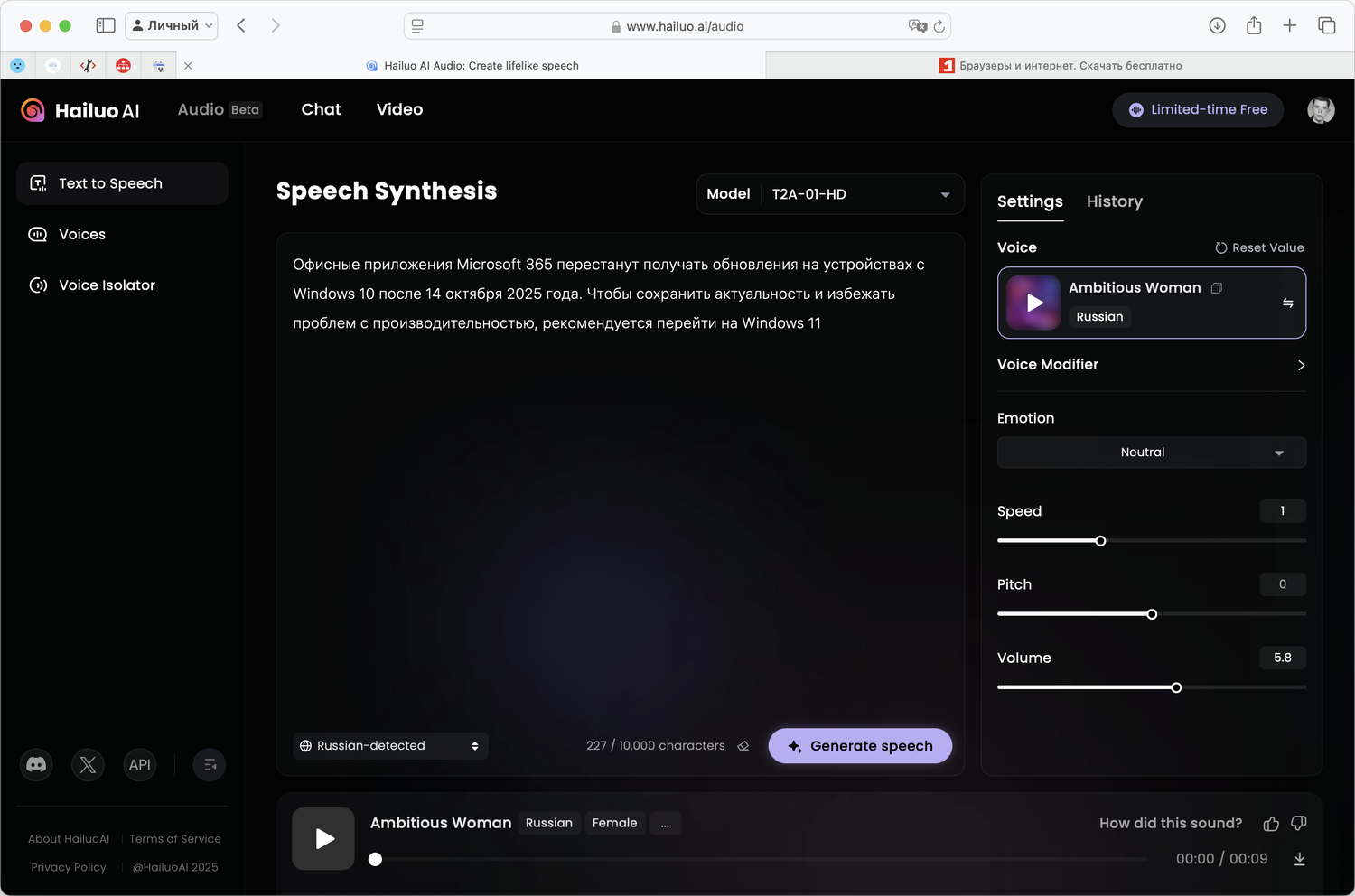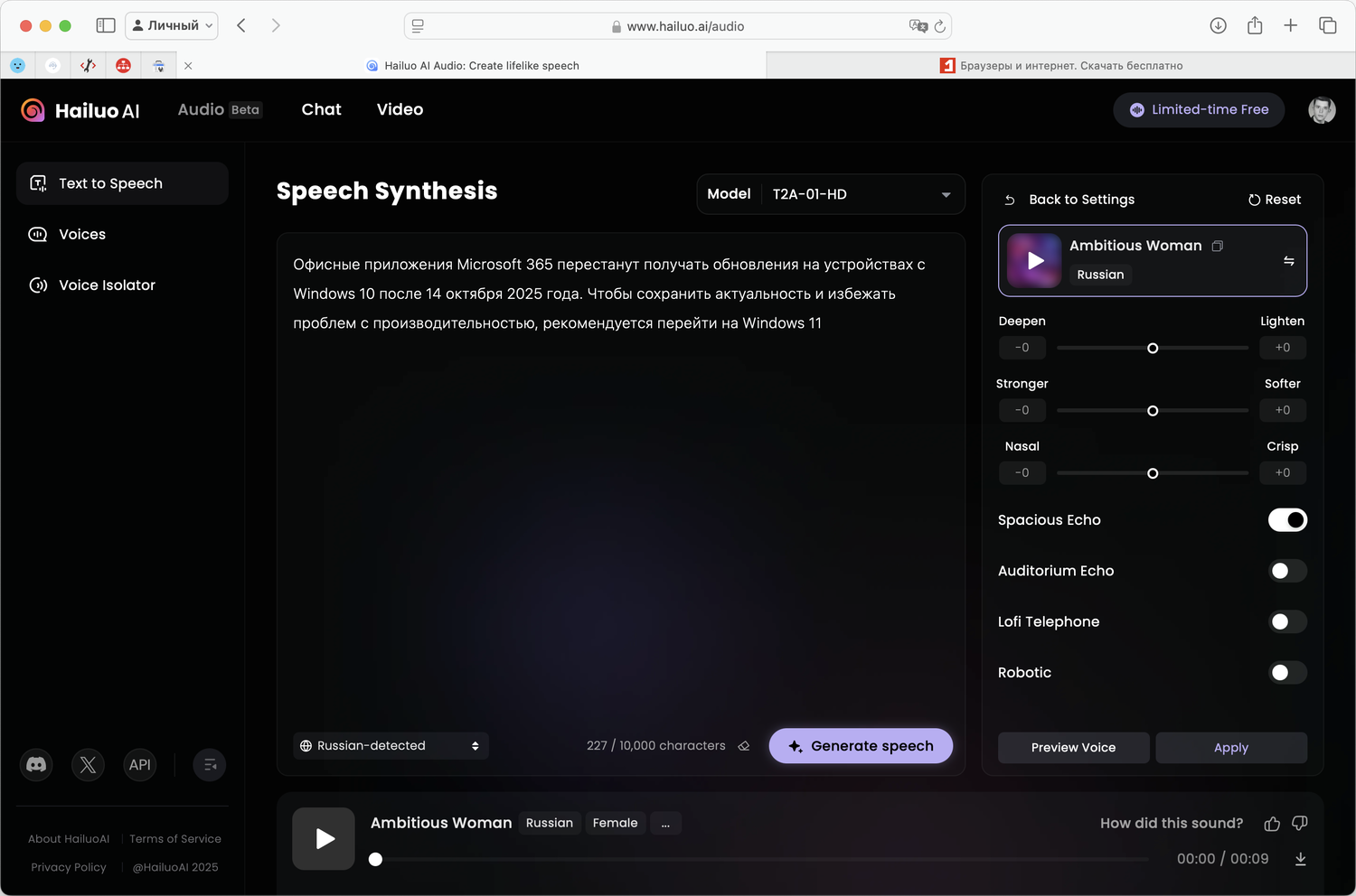 Компания Hailuo AI запустила новую модель T2A-01-HD для озвучивания текста и клонирования голоса. Мощный инструмент для работы с текстом и звуком, который может быть полезен для блогеров, создателей контента и других пользователей. Бесплатный доступ к широкому набору функций делает эту модель особенно привлекательной на текущий момент.
