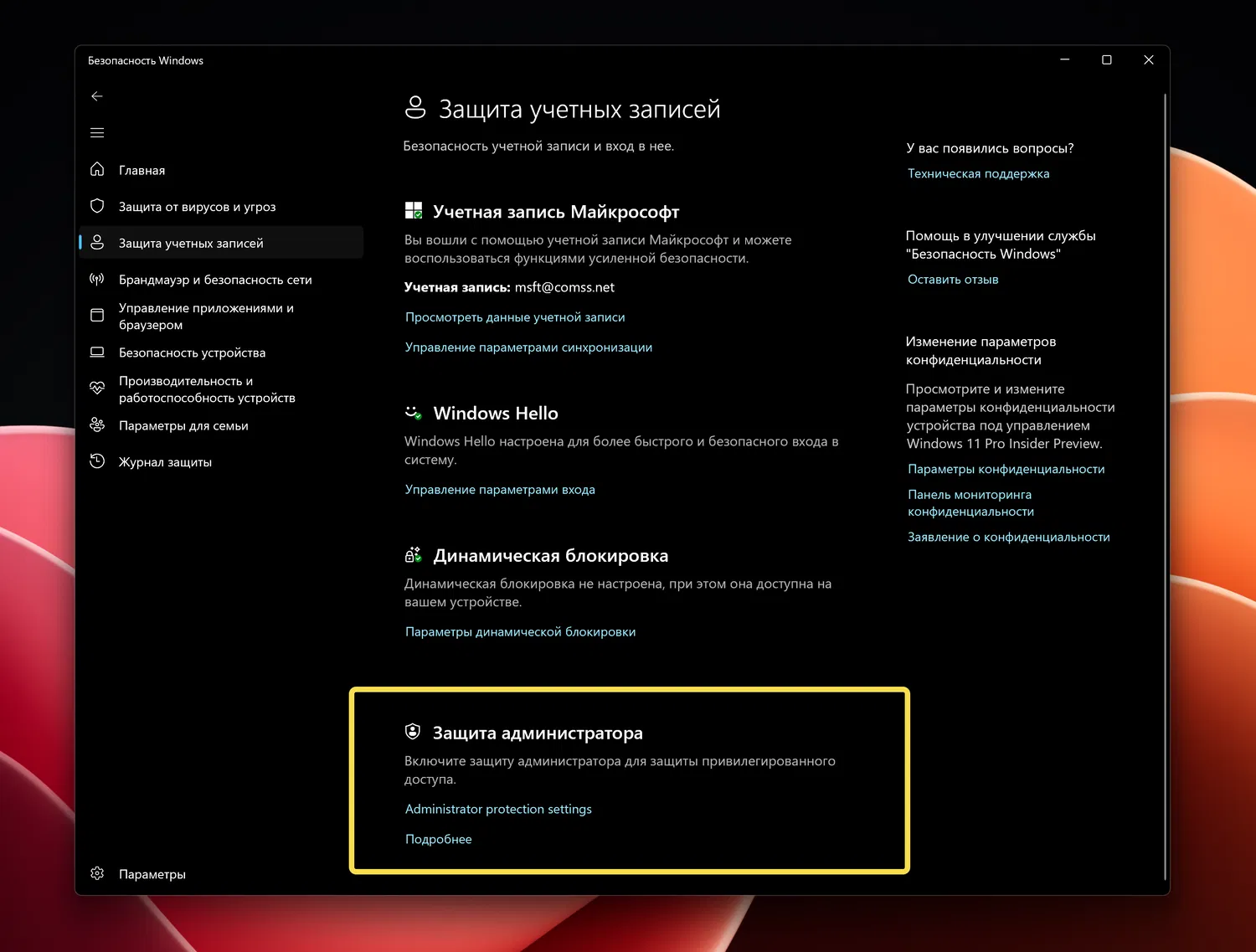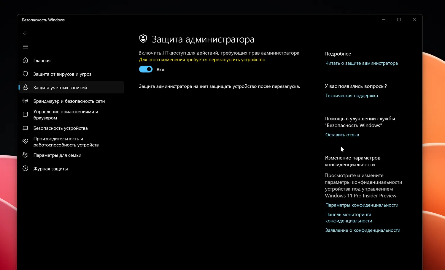 - Защиту администратора теперь можно включить в приложении Безопасность Windows в разделе Защита учетных записей > Защита администратора. Эта функция позволяет пользователям включать защиту без помощи ИТ-администраторов, а также доступна для пользователей домашней версии Windows. Изменение этой настройки требует перезагрузки ПК.