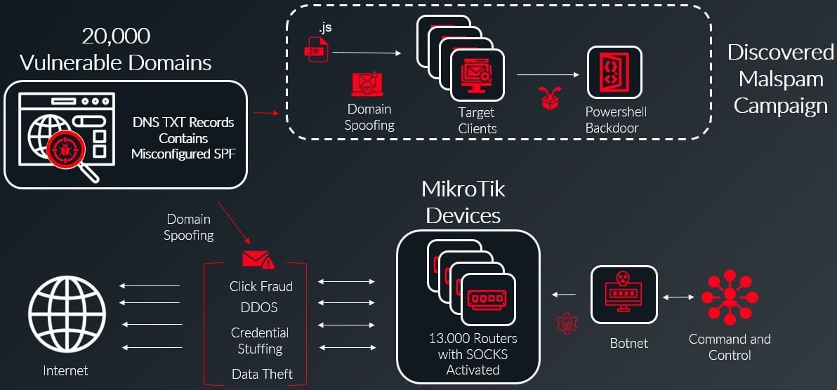 Недавно обнаруженный ботнет, состоящий из 13 000 устройств MikroTik, использует ошибочную настройку записей серверов доменных имен (DNS), чтобы обходить системы защиты электронной почты и распространять вредоносное ПО, подделывая около 20 000 доменов.