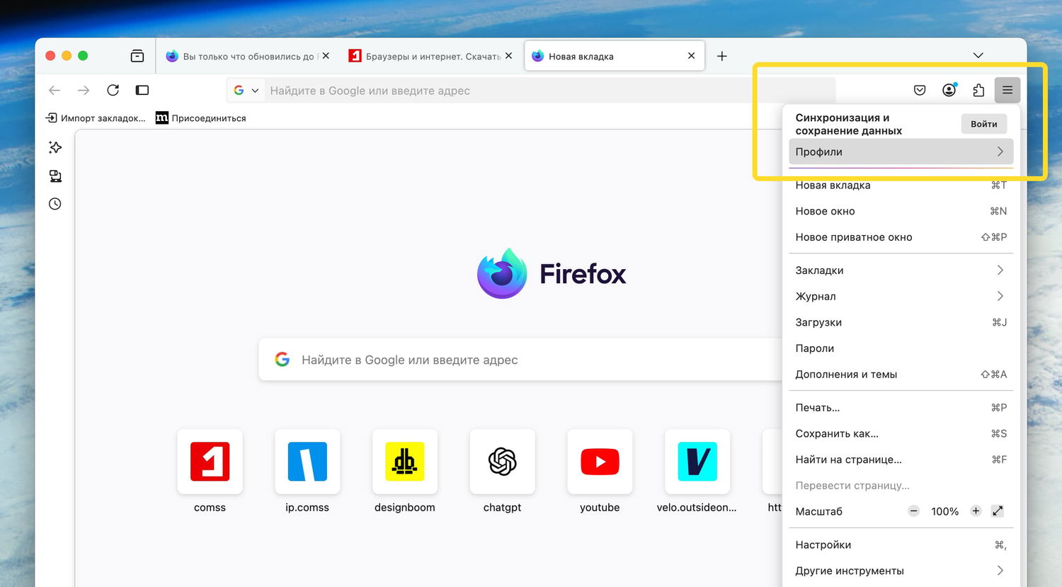 Нажатие на значок меню на панели инструментов Firefox отображает новую запись профилей. Еще одно нажатие отображает все существующие профили, возможность создания нового профиля и управления всеми профилями.