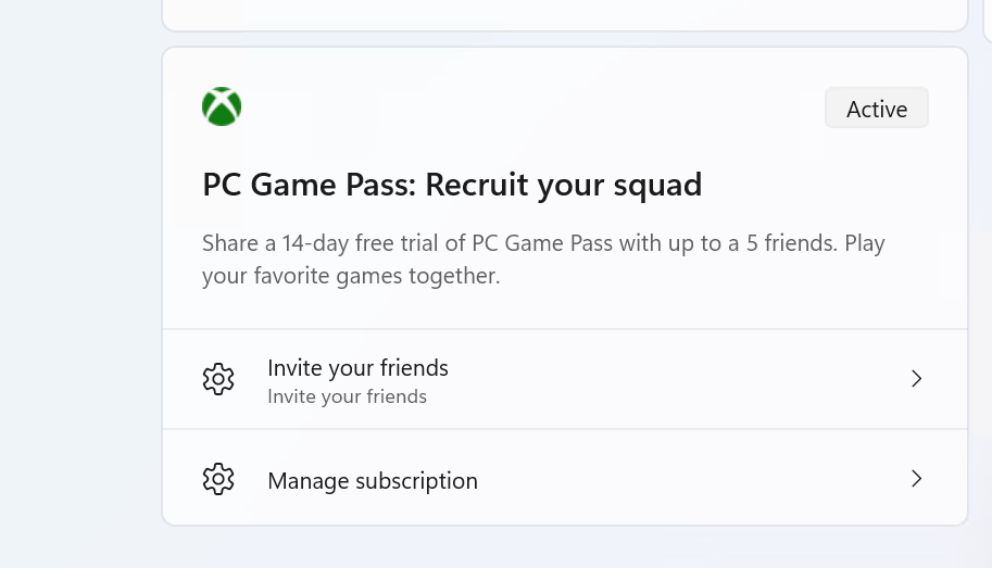 - Подписчики Game Pass Ultimate и PC Game Pass начнут видеть на главной странице настроек (приложение "Параметры") новую карточку для приглашения друзей попробовать PC Game Pass бесплатно. Карточка появится только при входе в учётную запись Microsoft и выполнении необходимых условий.