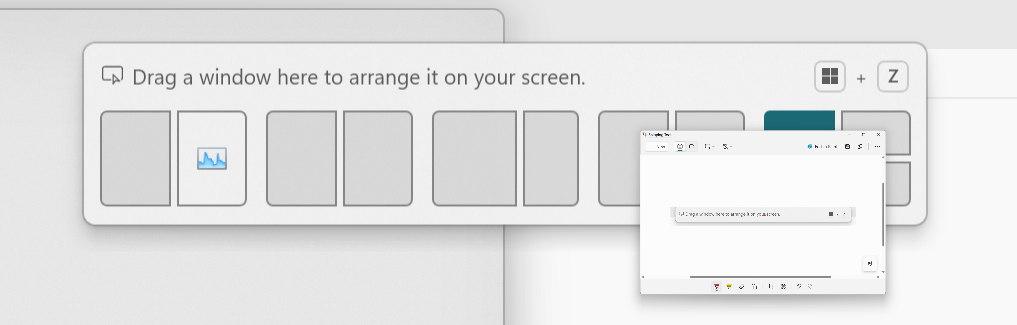 - В Windows 11 улучшена функция Приклепления окон ( Snap), чтобы упростить её изучение и использование. Теперь при случайном вызове панели привязки (Snap Bar) при перетаскивании приложения к верхней середине экрана или всплывающего окна привязки (Snap Flyout) при наведении на кнопки «Свернуть» или «Развернуть» будет отображаться встроенное сообщение с подсказками. Эти сообщения помогут пользователям понять, как привязывать окна, и узнать сочетания клавиш для ускорения работы с привязкой. В данный момент тестируется несколько вариантов улучшения.