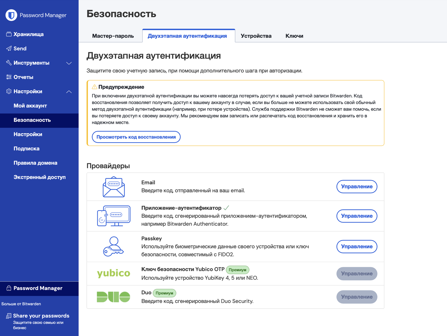 Пользователи могут настроить двухэтапную аутентификацию на сайте Bitwarden после входа в аккаунт. Поддерживаются приложения-аутентификаторы, электронная почта, ключи доступа, а также ключи безопасности (для премиум-пользователей).