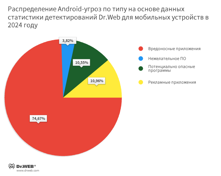 По данным экспертов компании «Доктор Веб», основными мобильными угрозами в 2024 году снова стали рекламные трояны. Также заметно выросла активность банковских троянов, троянов-вымогателей, кликеров и мошеннического ПО. Ниже приведены наиболее важные выводы и статистические данные, а также примеры самых распространенных и опасных вредоносных программ, с которыми сталкивались владельцы Android-устройств. Полный отчет «Доктор Веб»: Обзор вирусной активности для мобильных устройств за 2024 год доступен на официальном сайте.