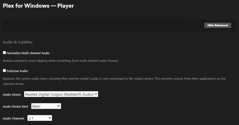 В случае с Plex (и, возможно, другими приложениями) важно правильно настроить аудиовыход, соответствующий вашей акустической системе. Например, если у вас используются стереодинамики (встроенные в монитор или настольные колонки), необходимо убедиться, что Plex правильно их распознает. Иначе звук может быть тише, так как Plex пытается воспроизводить все аудиоканалы через стереосистему, а некоторые из них могут звучать слабее.