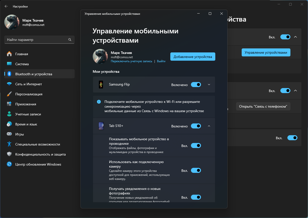 Встроенная страница настроек мобильных устройств в Windows 11 позволяет использовать ваш Android телефон или планшет как веб-камеру, просматривать файлы непосредственно в Проводнике и многое другое.