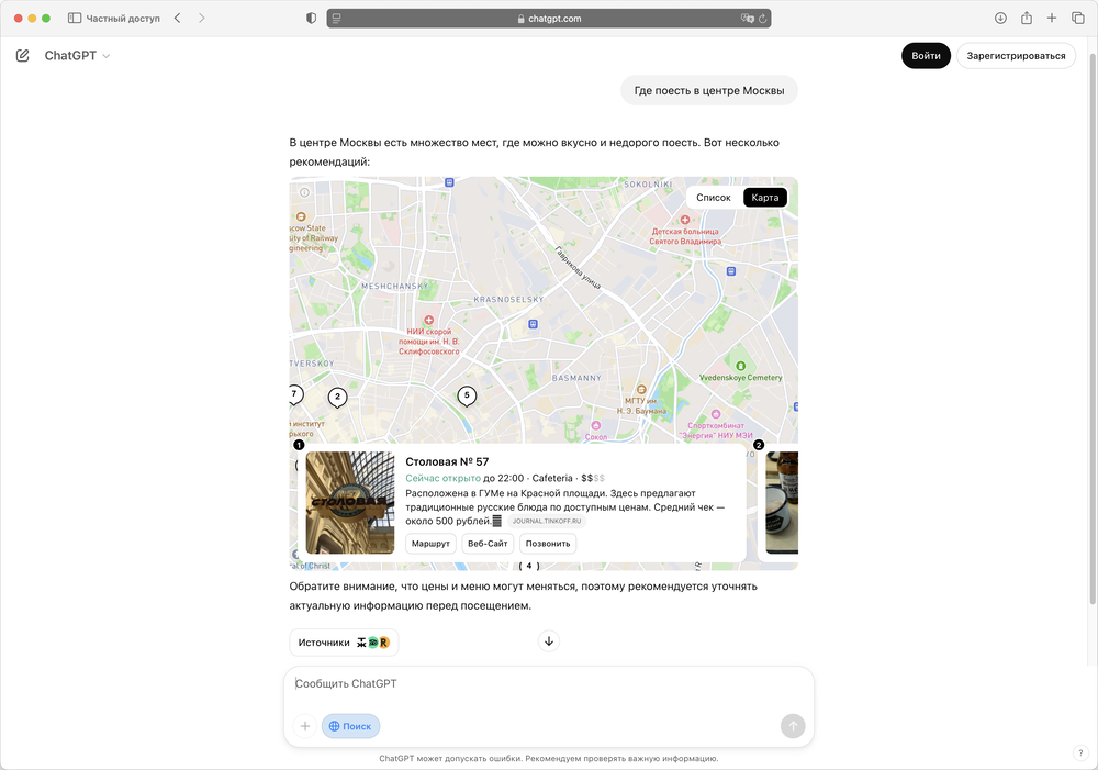 - ChatGPT Search предлагает более традиционный интерфейс поиска с картами, изображениями и краткими описаниями мест.