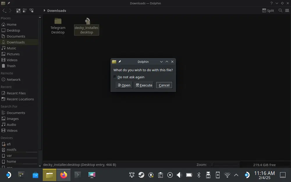 decky_installer.desktop. - При появлении запроса выберите Выполнить (Execute).