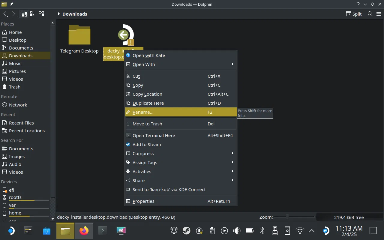 После нажатия кнопки в папку Загрузки (Downloads) будет сохранён файл с именем decky_installer.desktop. Если вы используете Firefox, файл может называться decky_loader.desktop.download. В этом случае необходимо переименовать его, удалив расширение «.download»: