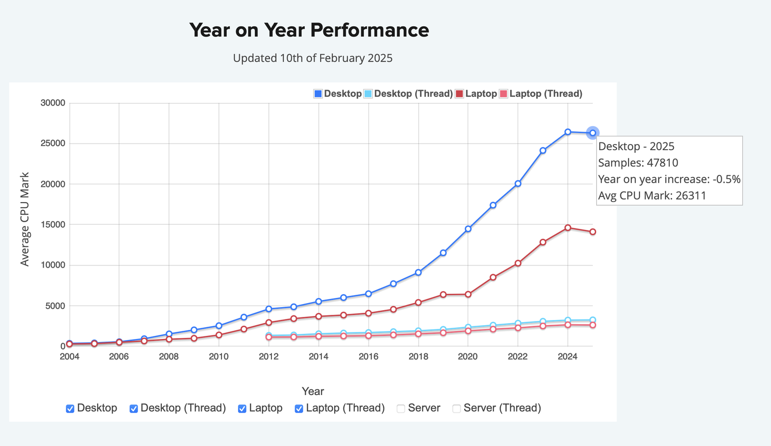 Этот график, показывающий производительность из года в год, составлен из тысяч результатов тестов PerformanceTest и обновляется каждые две недели. Диаграмма включает данные с версии PerformanceTest V5 до V11. PerformanceTest V8 (выпущенная в 2012 году) стала первой версией, которая собирала показатели однопоточной производительности.