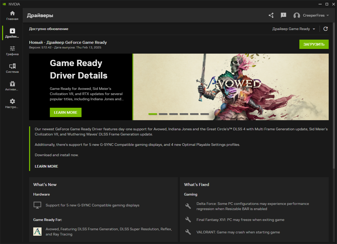Новая версия драйвера поддержку Avowed, обновление DLSS 4 для Indiana Jones and the Great Circle, DLSS Frame Generation для Sid Meier's Civilization VII и Wuthering Waves, а также поддержку новых дисплев G-SYNC и оптимальные настройки для популярных игр.