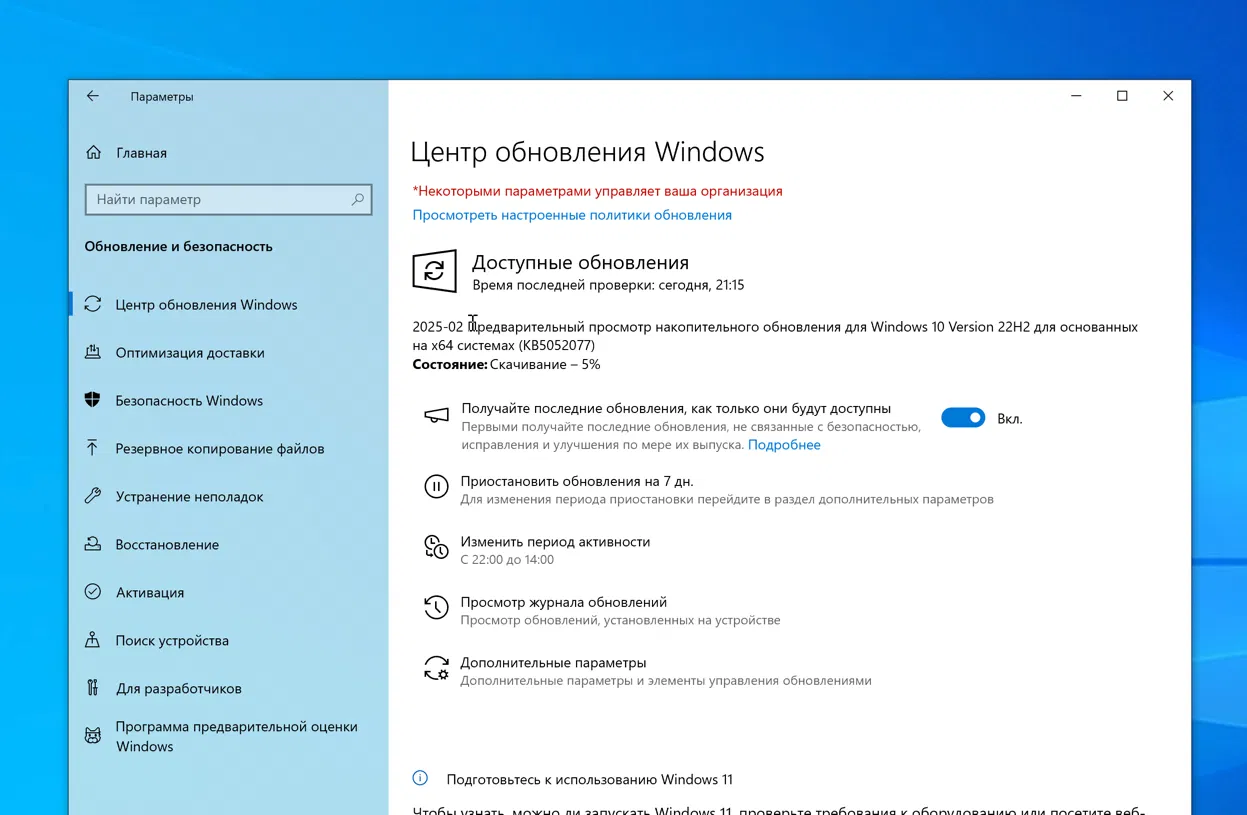 Обновлено: 13.02.2025. Обновление KB5052077 (Build 19045.5552) для Windows 10, версия 22H2 доступно участникам программы Windows Insider на канале предварительного выпуска Release Preview.