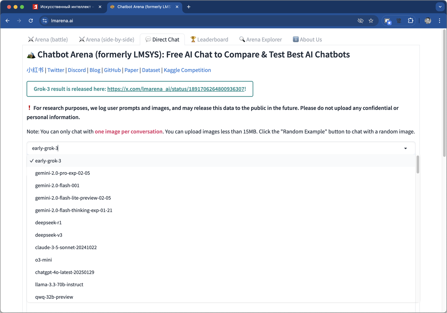 Вы можете опробовать Grok 3 через Chatbot Arena. Для этого зайдите на сайт, выберите режим сравнения (Arena side-by-side) или прямой режим (Direct Chat), в выпадающем списке выберите «early-grok-3» и введите пример запроса. Несмотря на то, что в Arena используется ранняя версия Grok 3, она остается мощной моделью — ведь она достигла вершины таблицы лидеров по сравнению с другими, уже обновленными моделями.