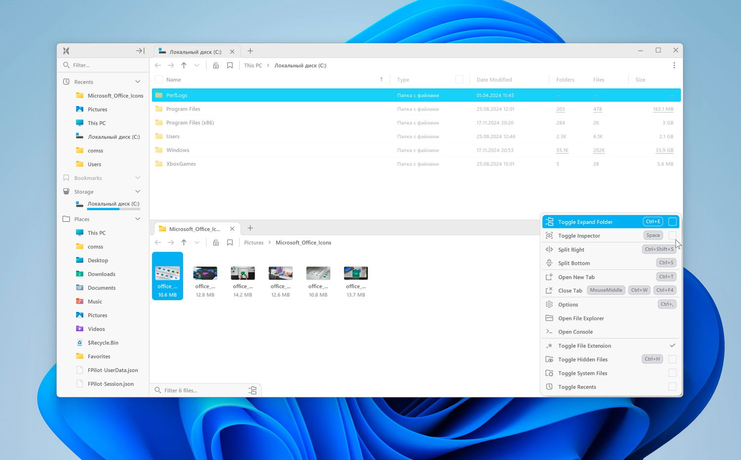 Еще одним преимуществом File Pilot являются контекстные меню — частая проблема для многих пользователей Windows 11. Здесь они работают как в Windows 10 — без лишних переключателей «показать больше опций» и задержек в работе. Приложение поддерживает сторонние действия, а также позволяет закреплять любимые элементы для быстрого доступа.