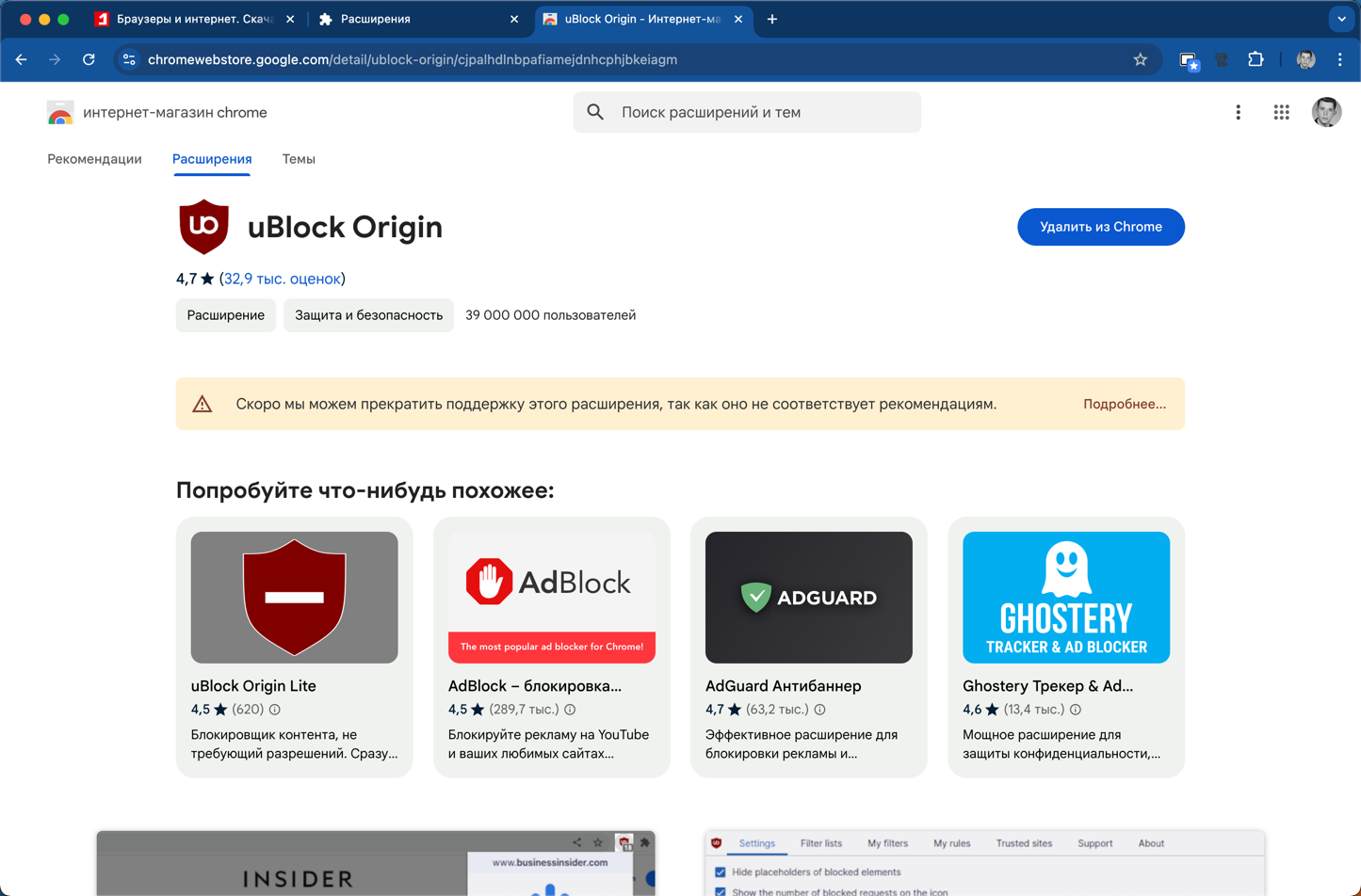 Кроме того, пользователи, пытающиеся скачать uBlock Origin из Chrome Web Store, получают уведомление о том, что его использование не рекомендуется – «Скоро мы можем прекратить поддержку этого расширения, так как оно не соответствует рекомендациям». Однако если расширение уже установлено, оно продолжает работать.
