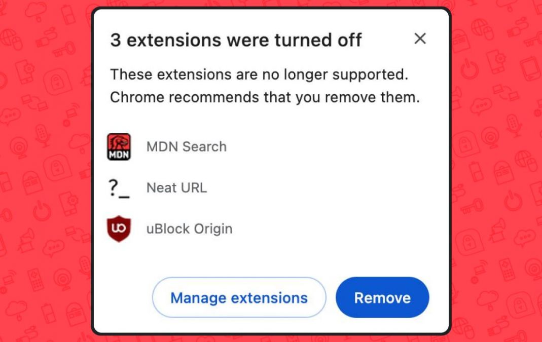 Ранее Chrome Web Store начал выдавать предупреждения о грядущем отключении расширений, основанных на Manifest V2. Летом 2024 года Google начала уведомлять пользователей Chrome о том, что uBlock Origin может скоро перестать работать.