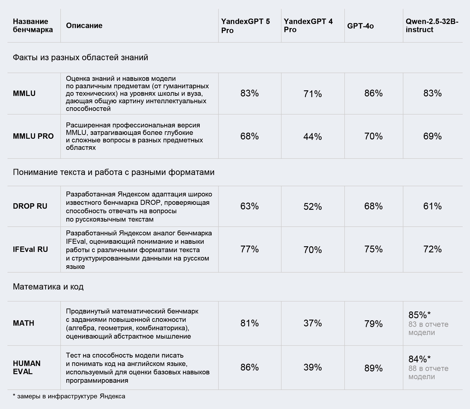 По результатам международных тестов, а также их адаптаций под русский язык, YandexGPT 5 Pro вплотную приблизилась к GPT-4o и по ряду показателей не уступает ей, а в некоторых случаях превосходит. Если сравнивать с Qwen-2.5-32b-Instruct, то YandexGPT 5 Pro выдаёт более точные ответы на фактовые запросы и лучше соблюдает заданный формат, уступая лишь в математических задачах.