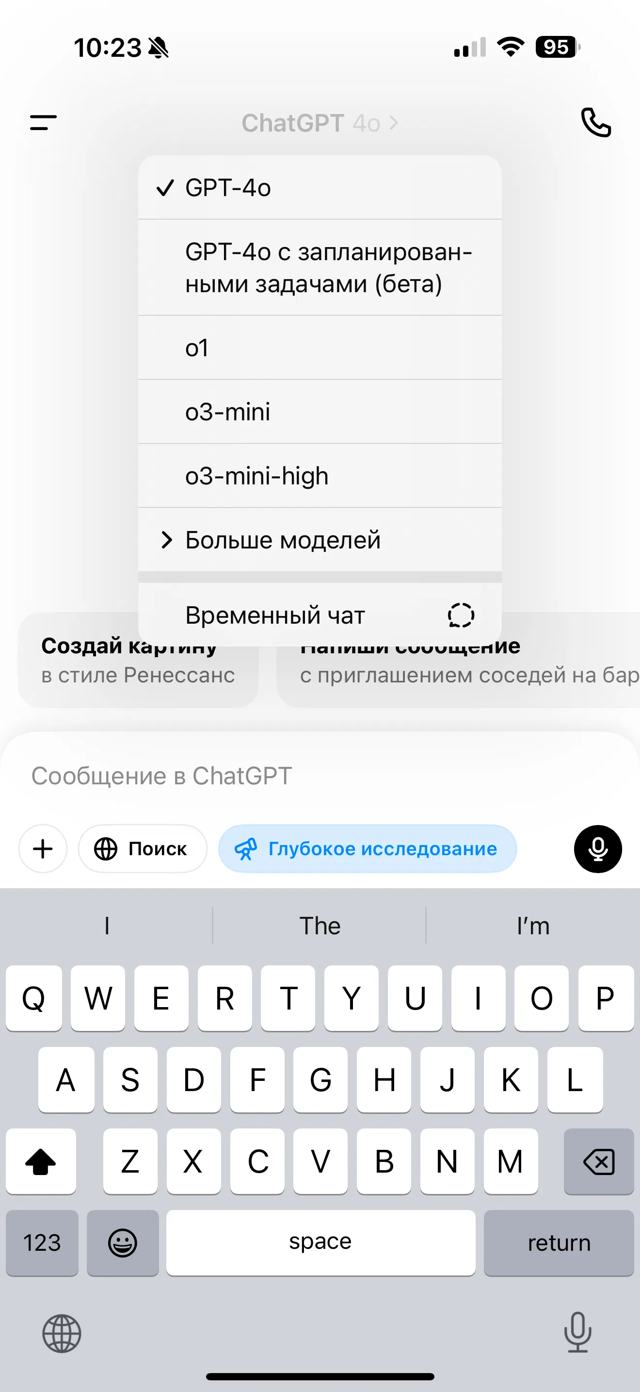 - Введите запрос и выберите «Глубокое исследование» в поле ввода сообщений.