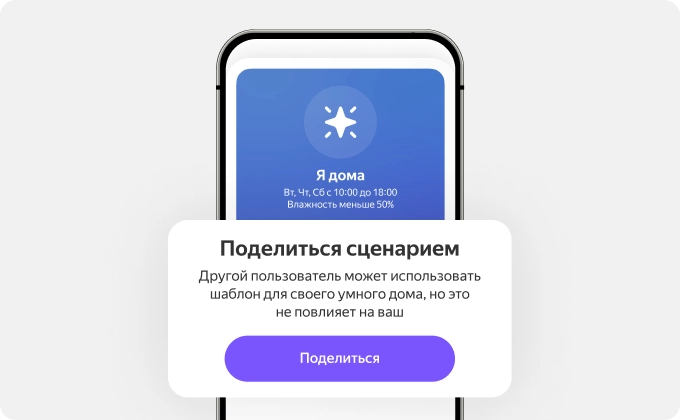 Передача сценариев осуществляется через опцию «Поделиться» в настройках приложения «Дом с Алисой для Android» / «Дом с Алисой для iPhone».