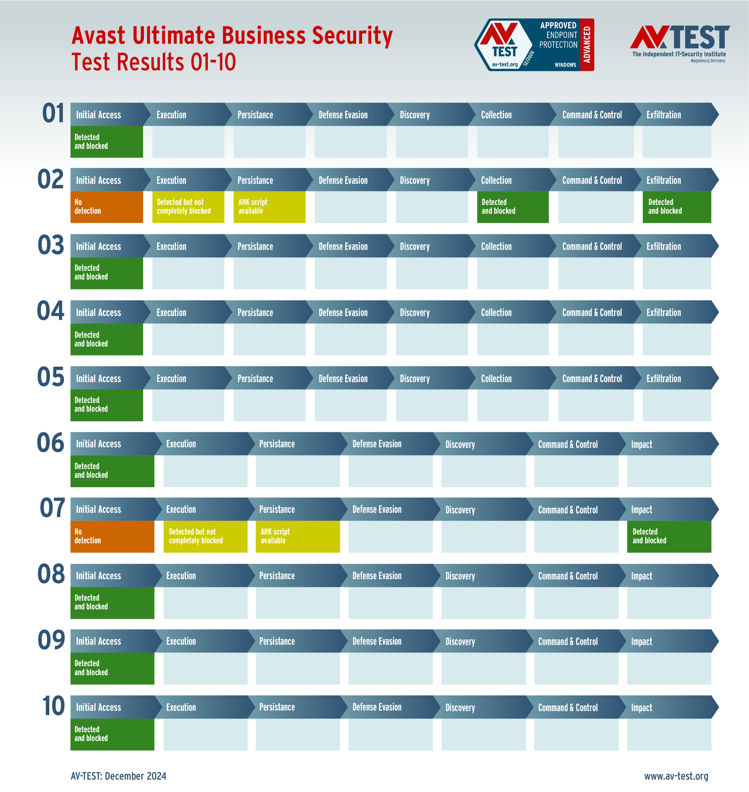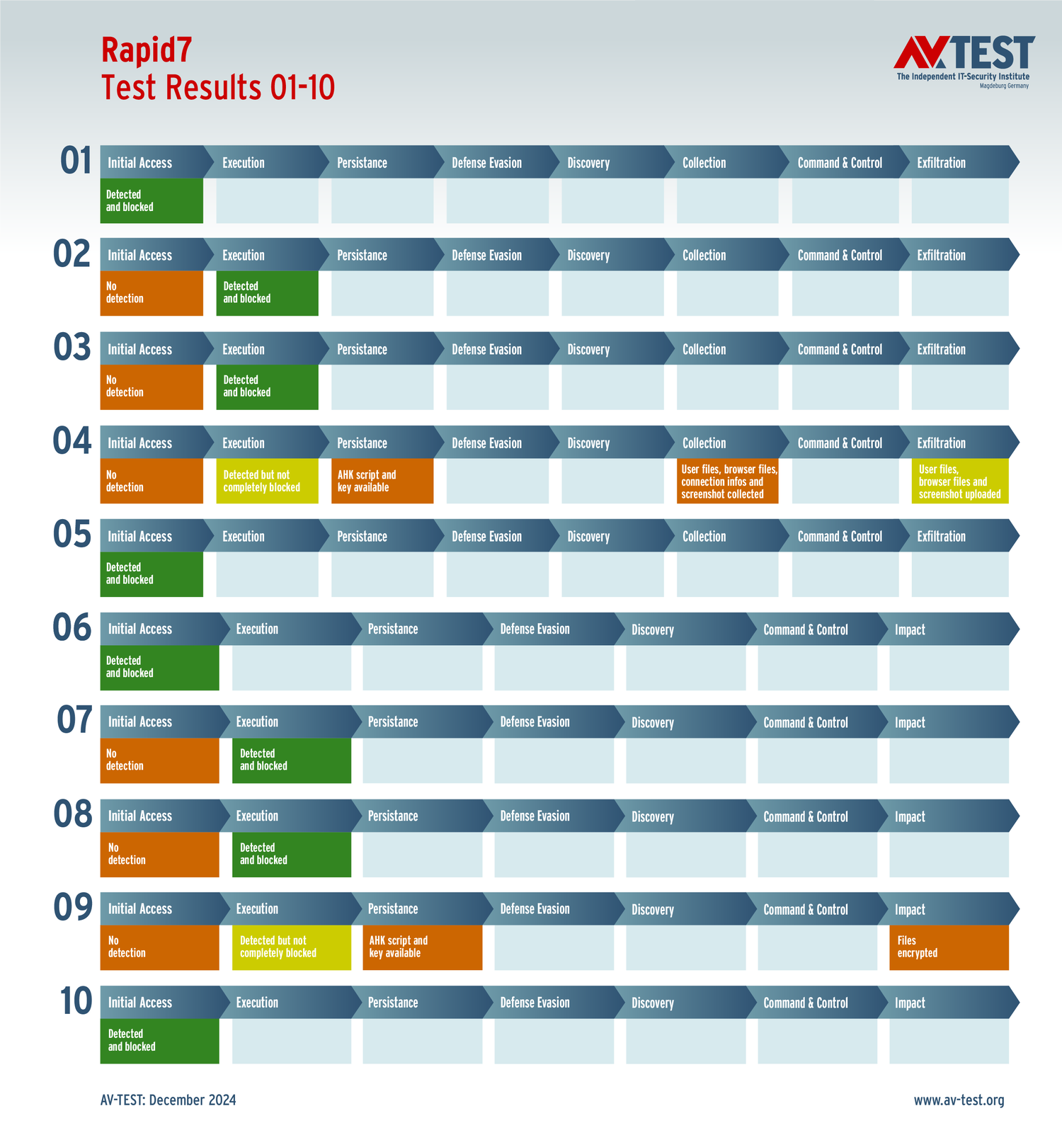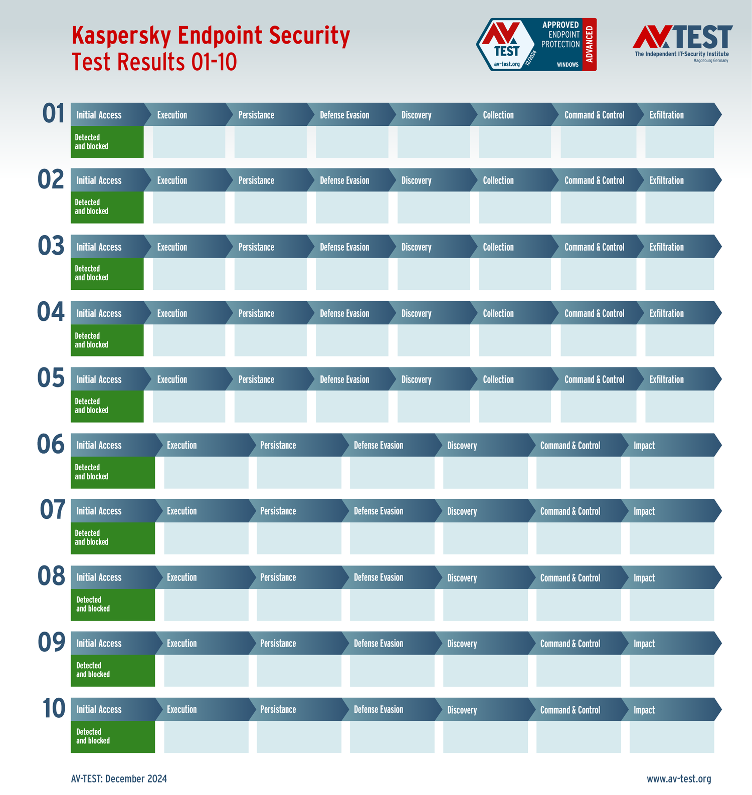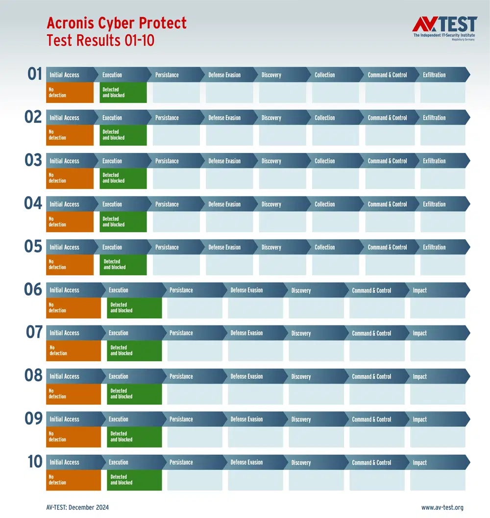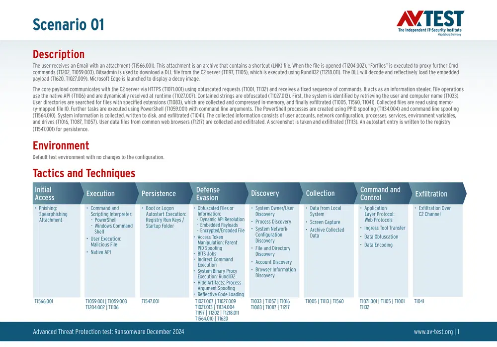 Все антивирусы должны были успешно защитить систему от 5 вариантов программ-вымогателей и 5 образцов ПО для кражи данных в 10 реальных сценариях. Каждый сценарий атаки описан в матрице в соответствии со стандартом MITRE ATT&CK. Определены все отдельные этапы атаки, а также задокументированы защитные реакции. Таким образом, вредоносное ПО может быть обнаружено сразу или остановлено на более поздних этапах защиты.