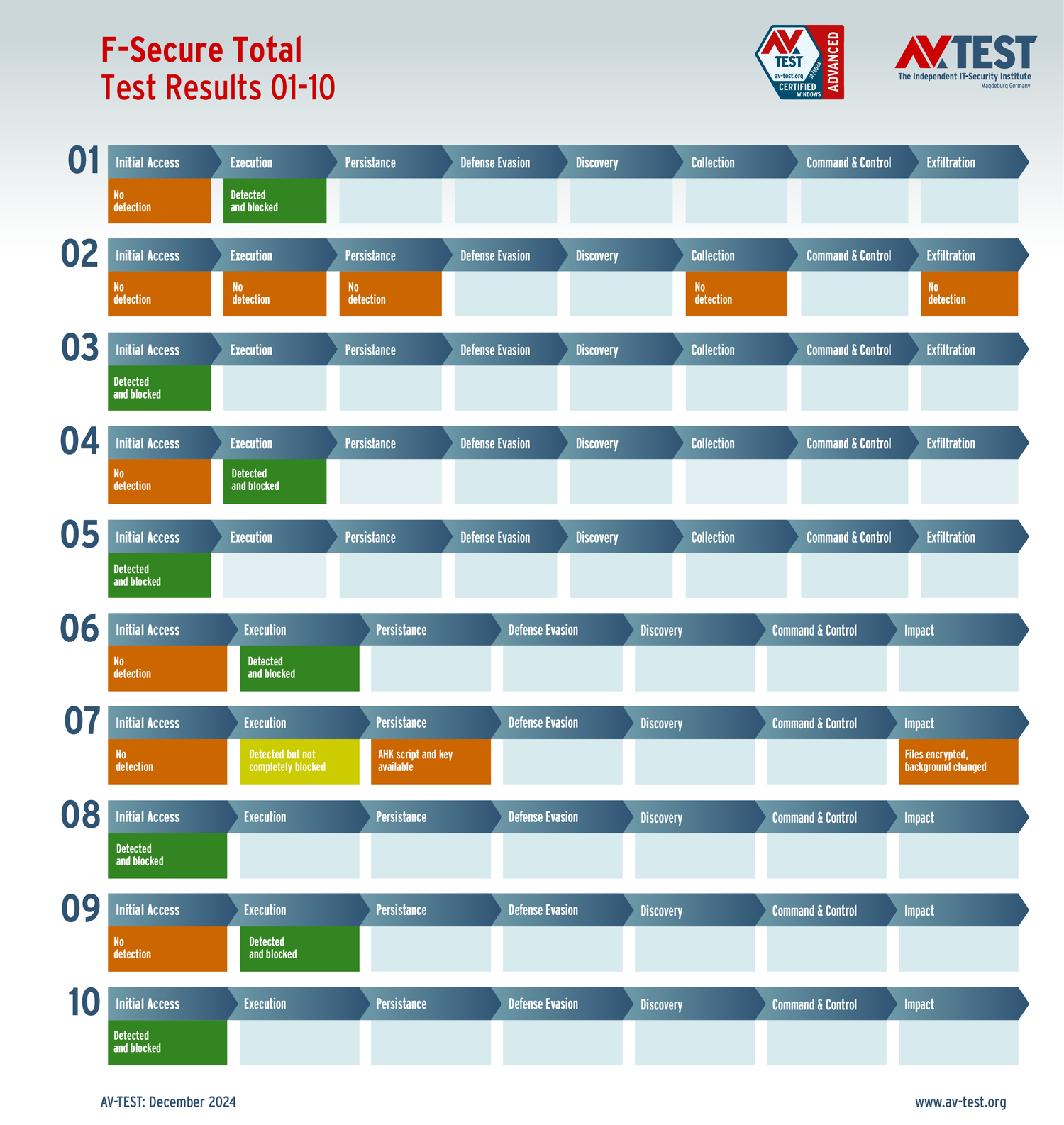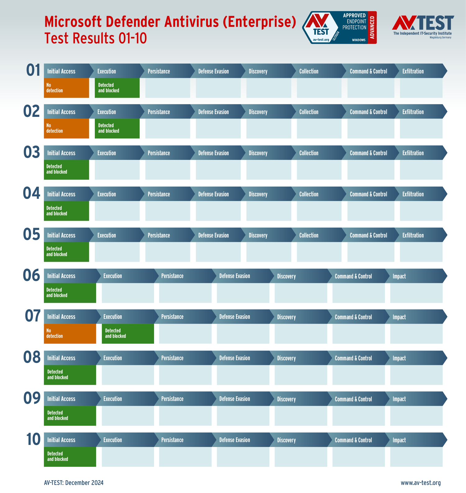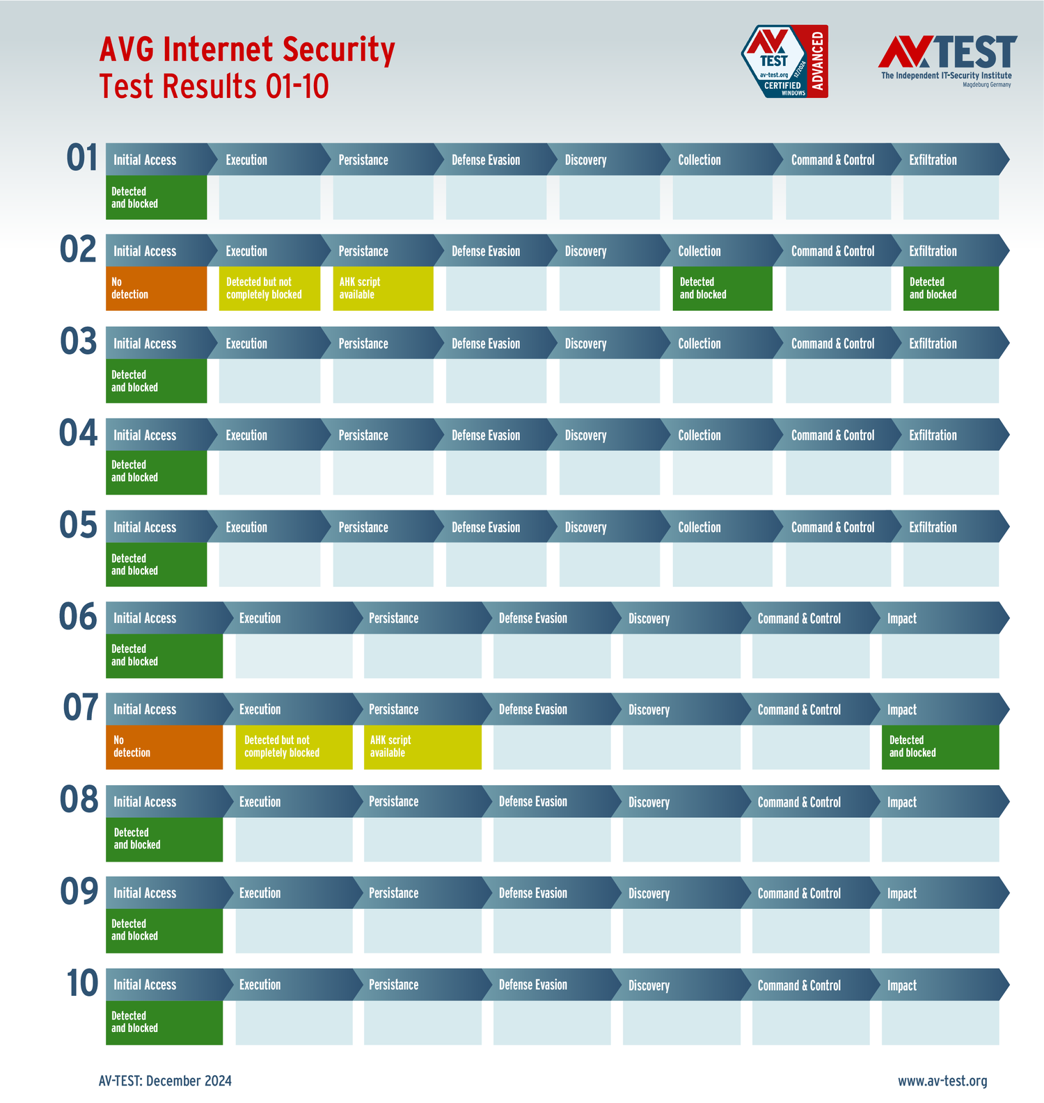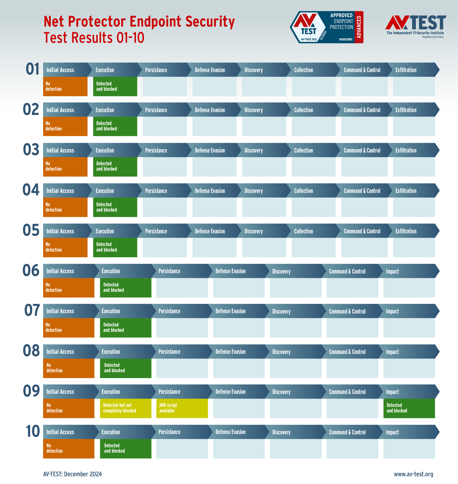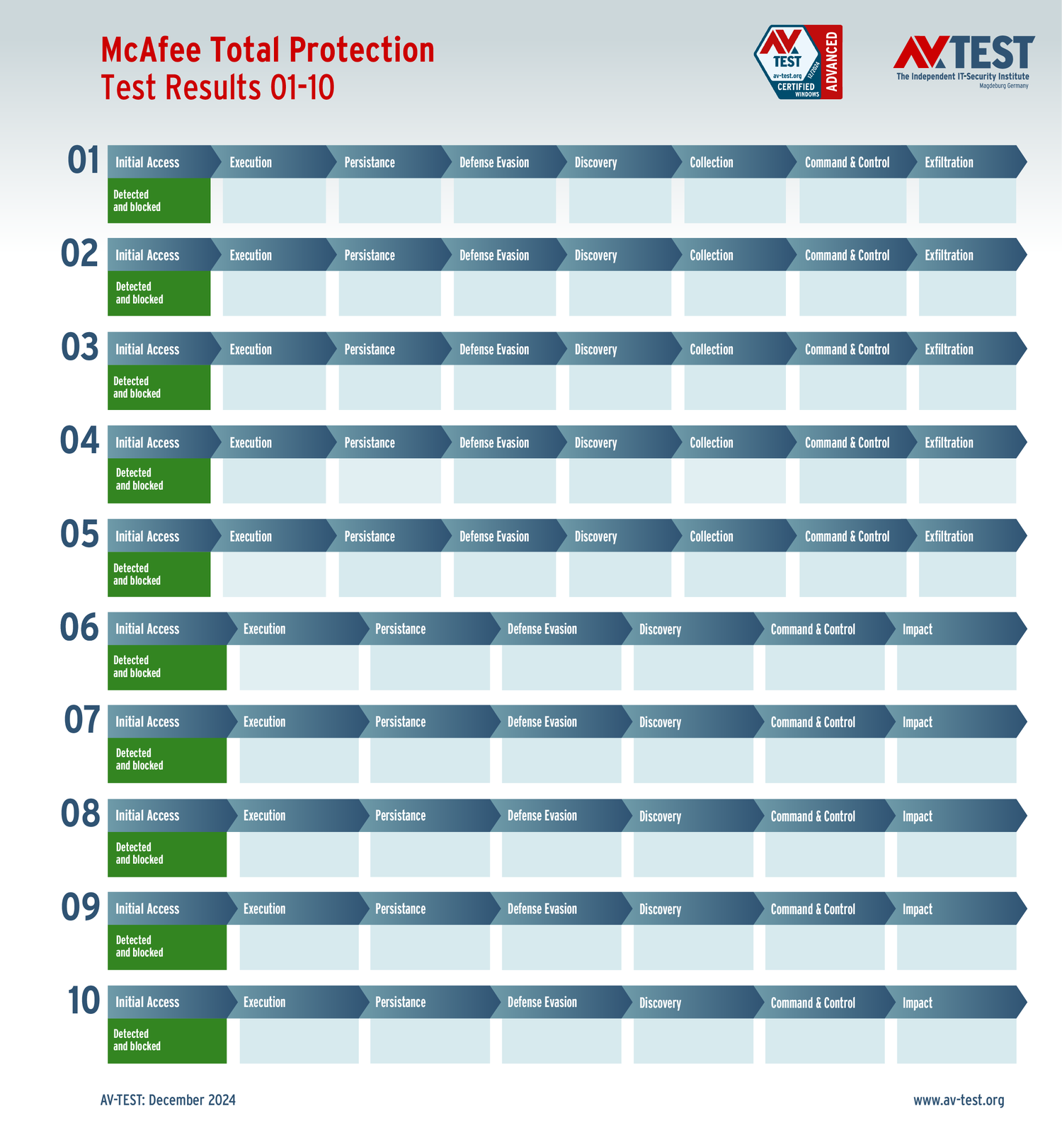 Все антивирусы должны были успешно защитить систему от 5 вариантов программ-вымогателей и 5 образцов ПО для кражи данных в 10 реальных сценариях. Каждый сценарий атаки описан в матрице в соответствии со стандартом MITRE ATT&CK. Определены все отдельные этапы атаки, а также задокументированы защитные реакции. Таким образом, вредоносное ПО может быть обнаружено сразу или остановлено на более поздних этапах защиты.