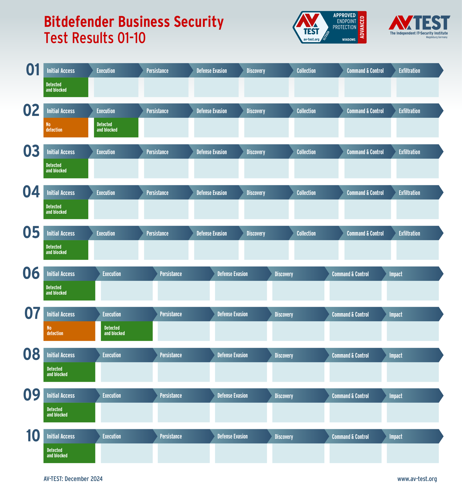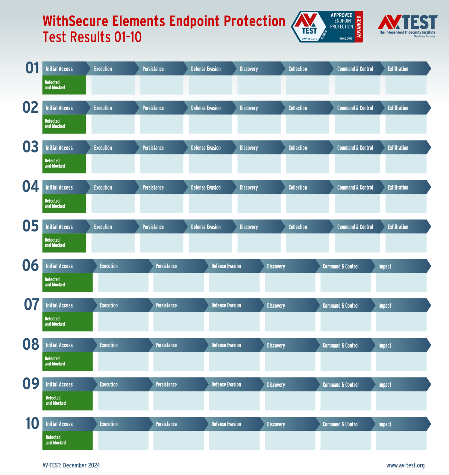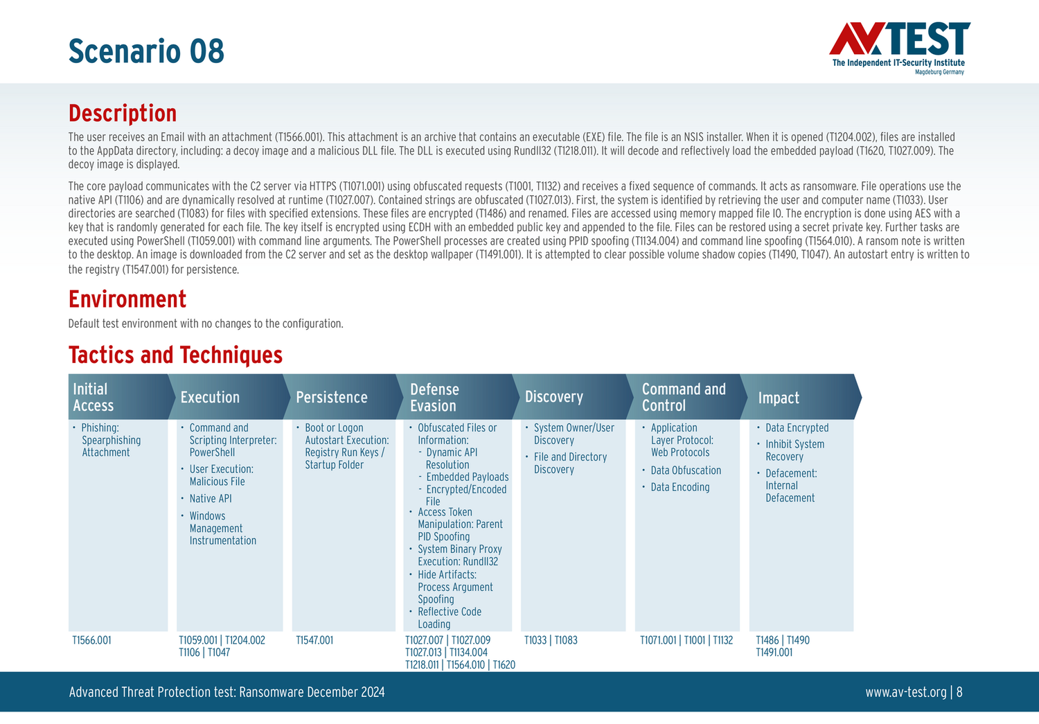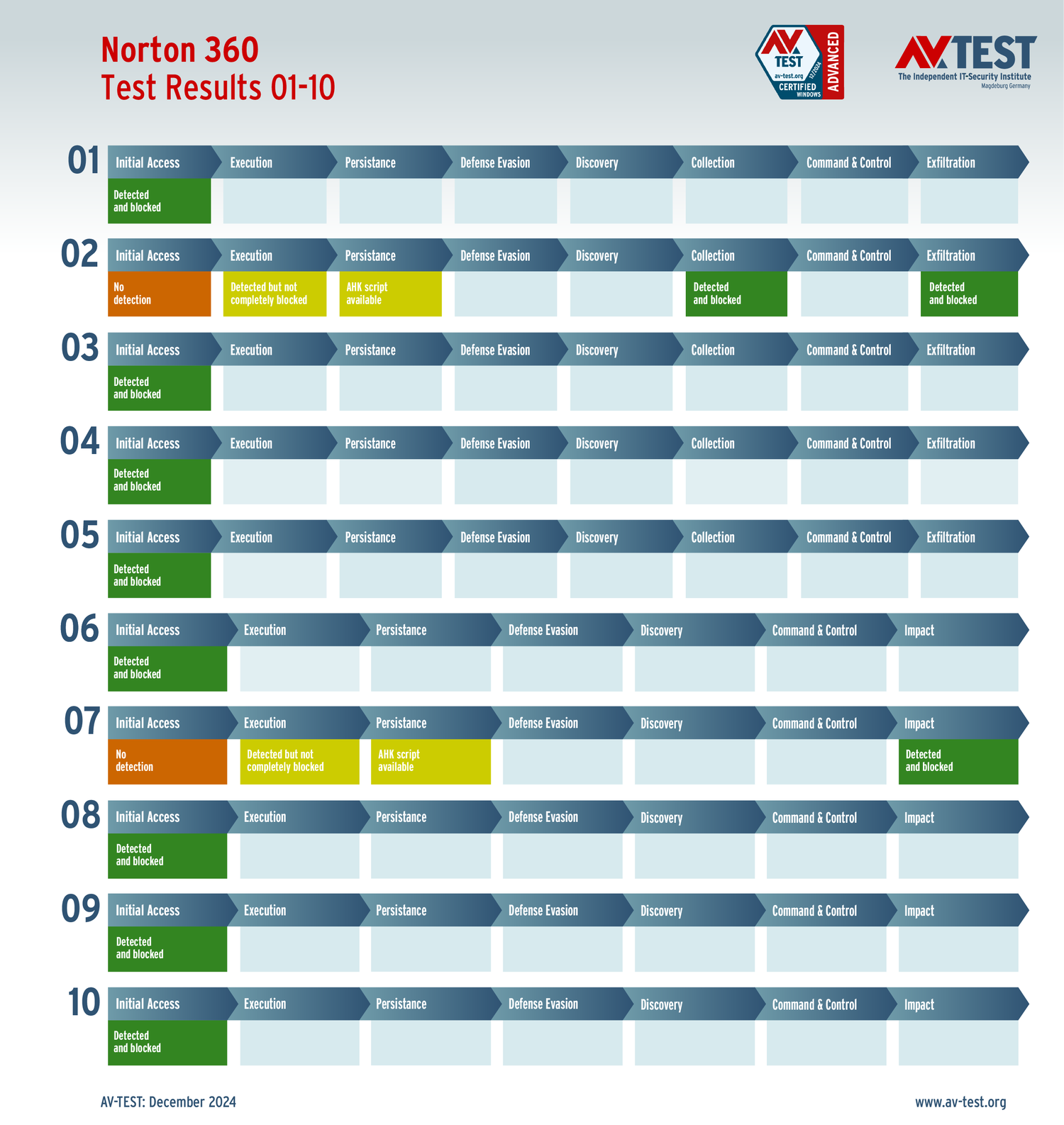 Все антивирусы должны были успешно защитить систему от 5 вариантов программ-вымогателей и 5 образцов ПО для кражи данных в 10 реальных сценариях. Каждый сценарий атаки описан в матрице в соответствии со стандартом MITRE ATT&CK. Определены все отдельные этапы атаки, а также задокументированы защитные реакции. Таким образом, вредоносное ПО может быть обнаружено сразу или остановлено на более поздних этапах защиты.