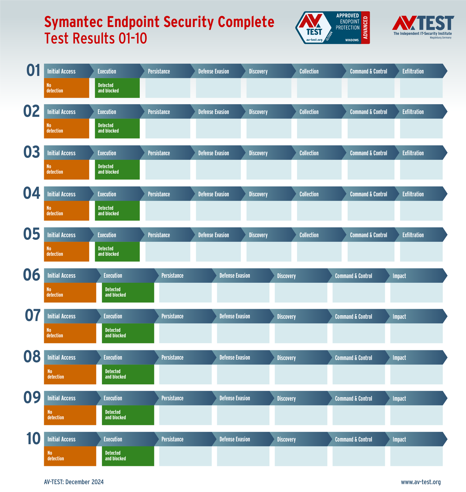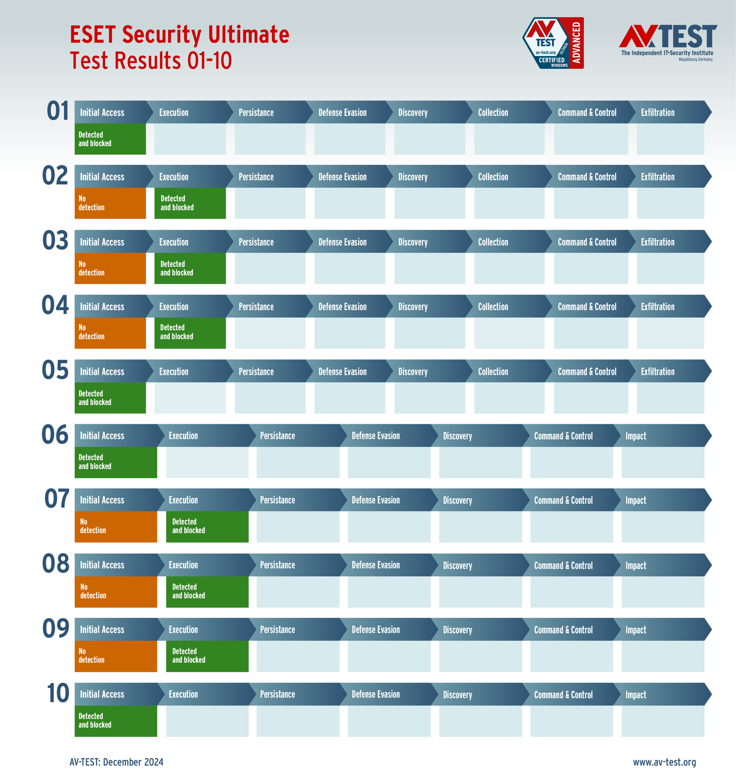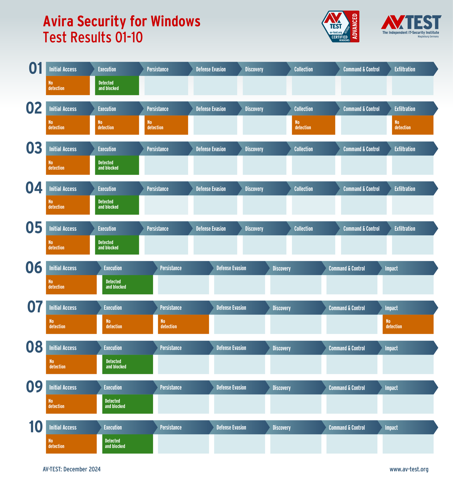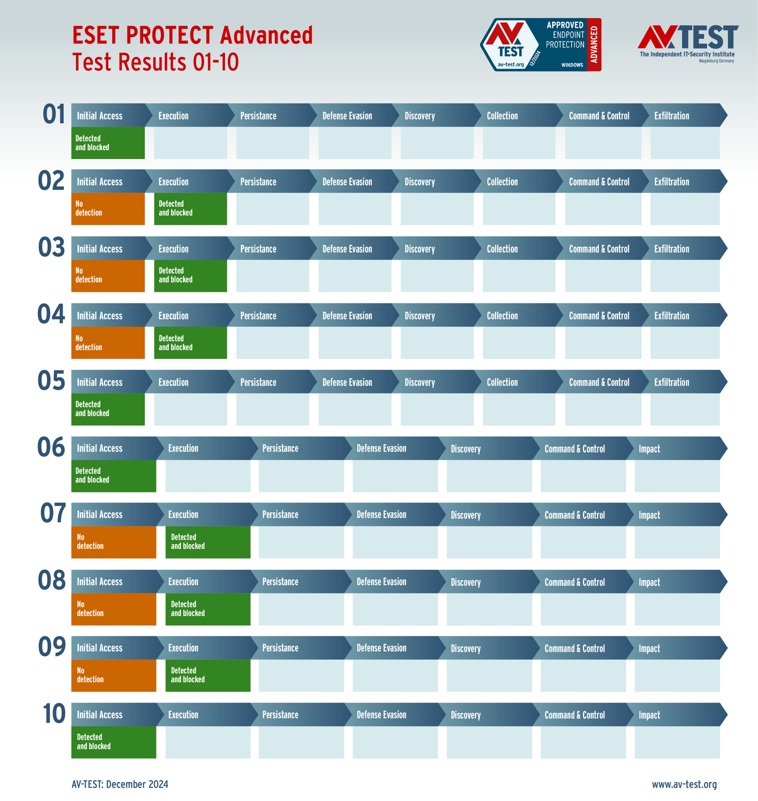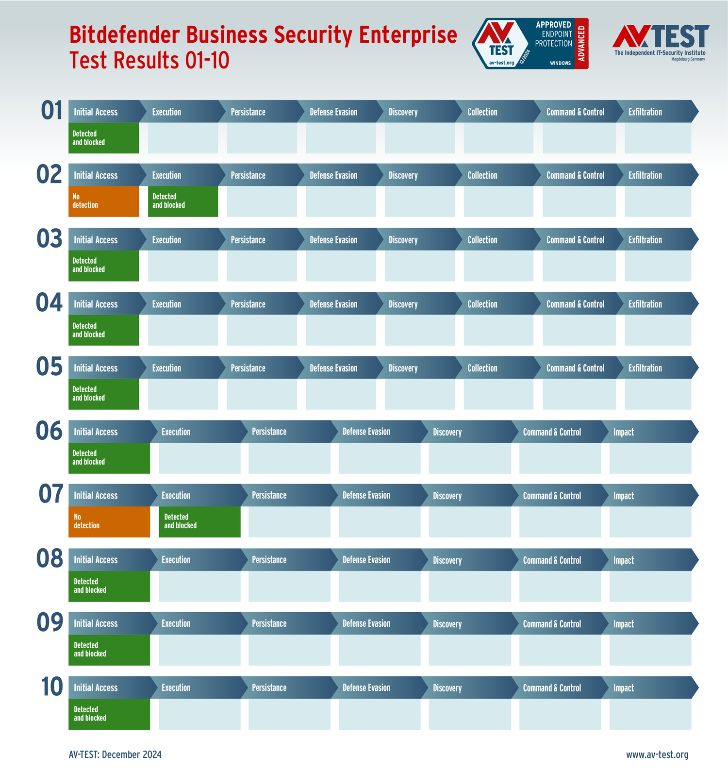 Все антивирусы должны были успешно защитить систему от 5 вариантов программ-вымогателей и 5 образцов ПО для кражи данных в 10 реальных сценариях. Каждый сценарий атаки описан в матрице в соответствии со стандартом MITRE ATT&CK. Определены все отдельные этапы атаки, а также задокументированы защитные реакции. Таким образом, вредоносное ПО может быть обнаружено сразу или остановлено на более поздних этапах защиты.
